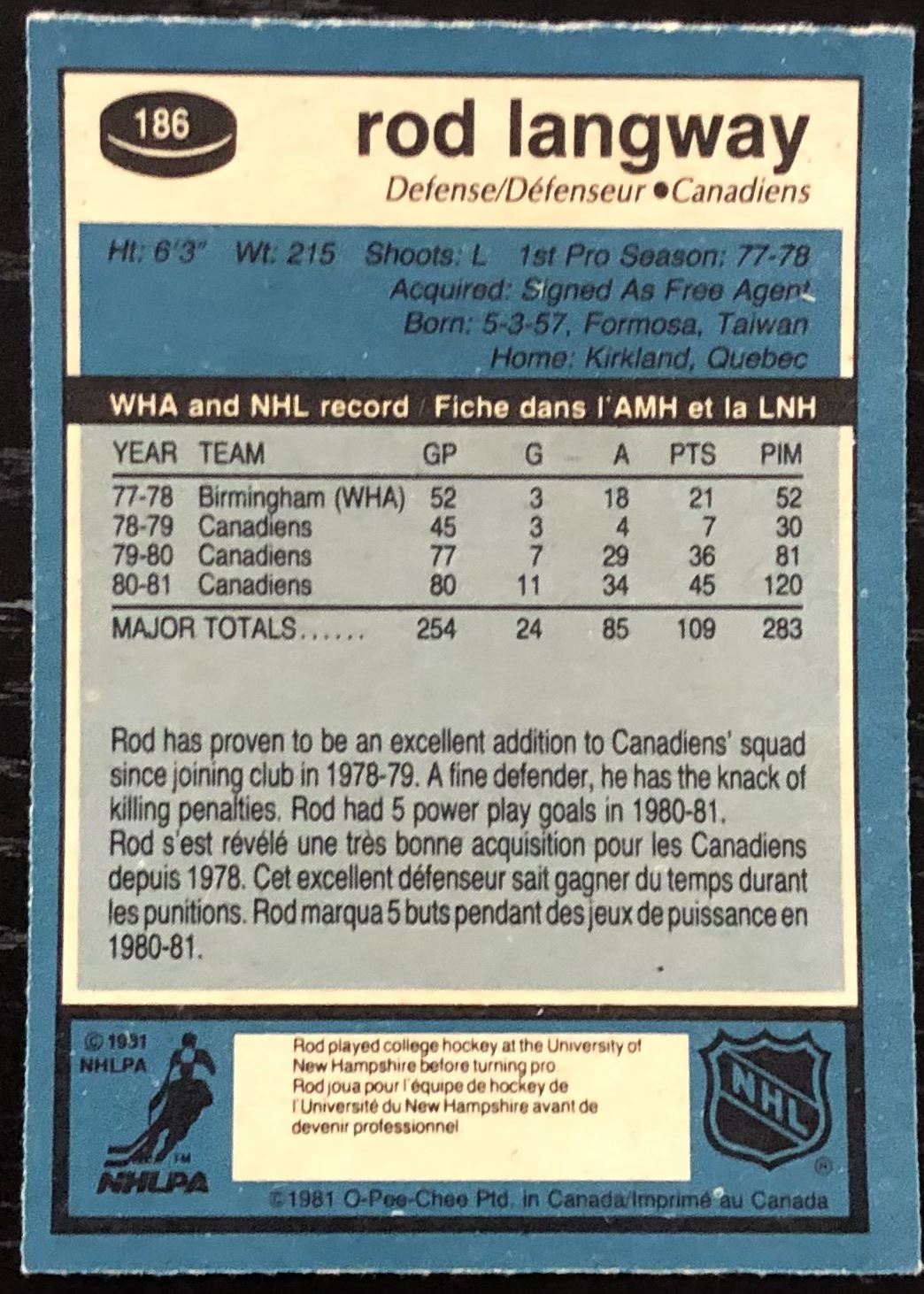 Card #186 OPC, NHL, hockey, vintage, hall of fame