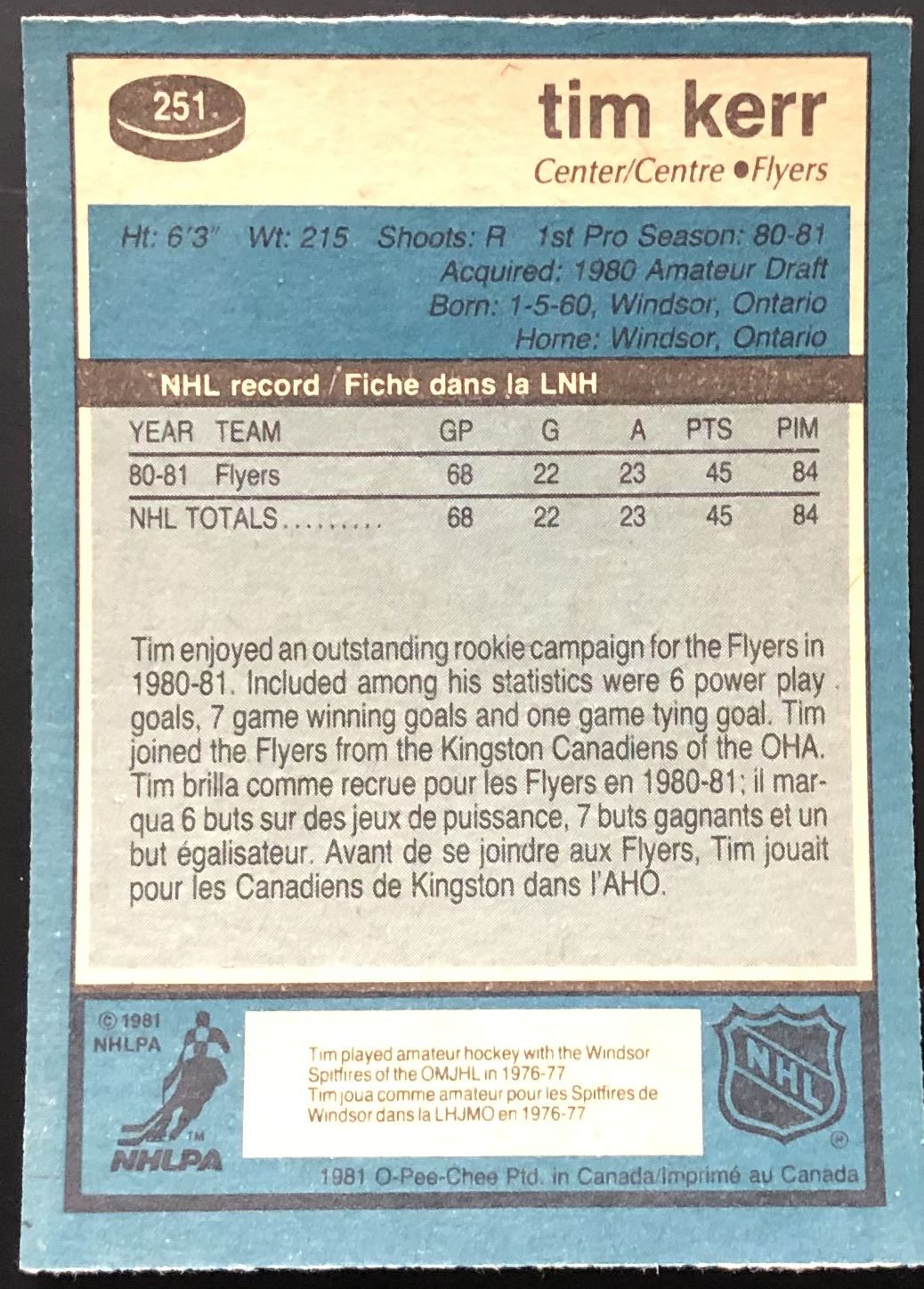 Card #251 NHL, hockey, OPC, vintage, rookie