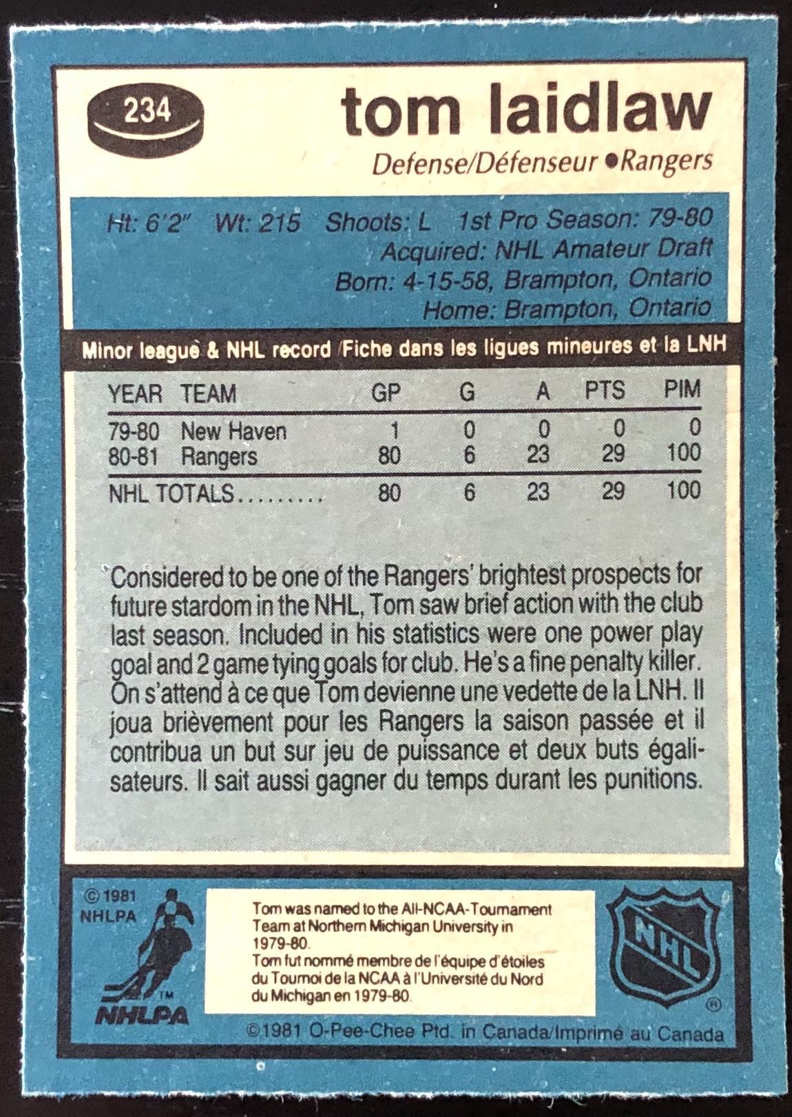 Card #234 NHL, hockey, OPC, vintage, rookie