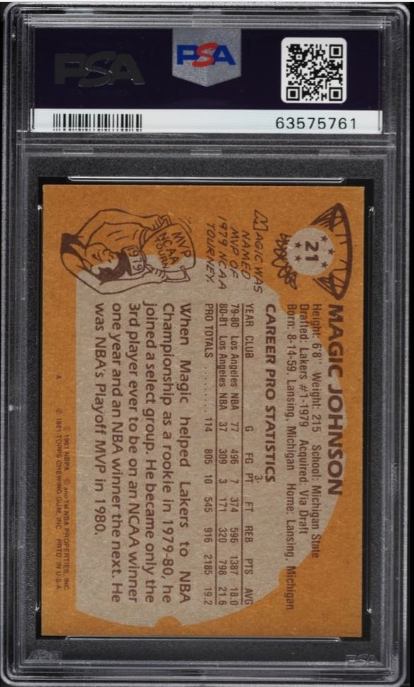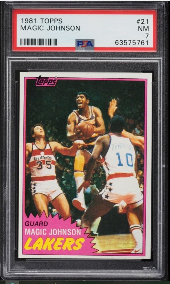 2nd-year card of all-time great Laker, Magic Johnson. He was a 3x MVP (6 other top 5 voting), 9x 1st Team All-Star, a 5x NBA Champion and 3x NBA Finals MVP. He holds the all-time record for highest career assists-per-game average (11.2), the highest playoff assists-per-game average (12.4), and the most career playoff triple-doubles (30). Graded 7 NM by PSA!