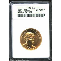 1981 American Arts Commemorative Series Half Ounce Gold Medal MS66 ANACS. Willa Cather. This is a lustrous, shimmering, yellow-gold Gem whose smooth surfaces are comfortably at home at the MS66 grade level. Important notice: We expect to be auctioning lots at the rate of 200-250 per hour. Sometimes eBay Premier live bid software cannot keep up with that pace, so we strongly recommend that you place a realistic proxy bid now as insurance to avoid disappointment. Also please note that all Heritage/CAA lots purchased through eBay Premier carry a 20% Buyer's Premium. Please make sure you read the Terms and Conditions.