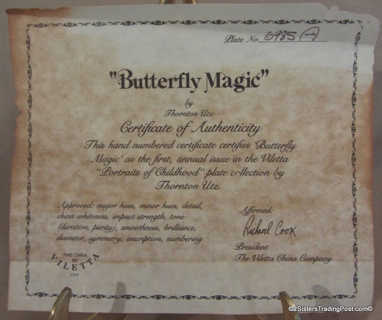 8 1/2" plate, dated 1981 'Butterfly Magic' this plate is the first in the Viletta annual plate collection 'Portraits of Childhood' by Thornton Utz. The plate has 24K gold rim, plate number 6985 A, Firing date 11-27-81, Firing master R. T, comes in the original box, with paperwork and COA. (Please see images for details)