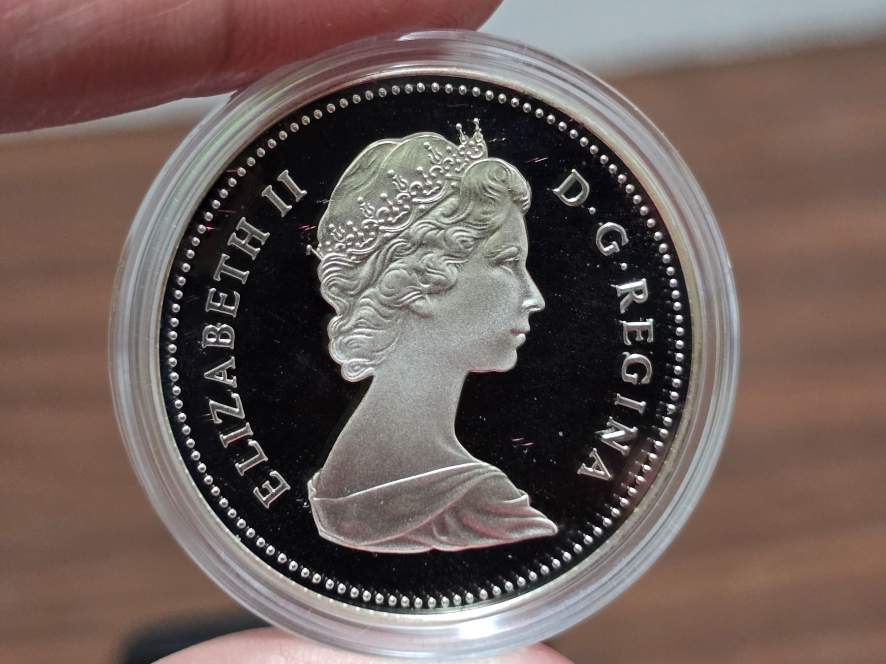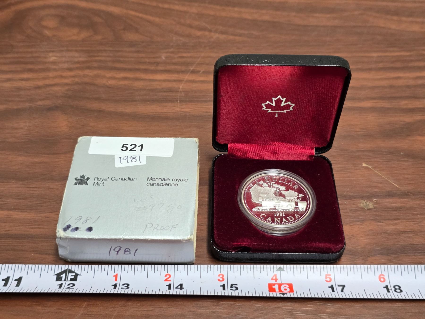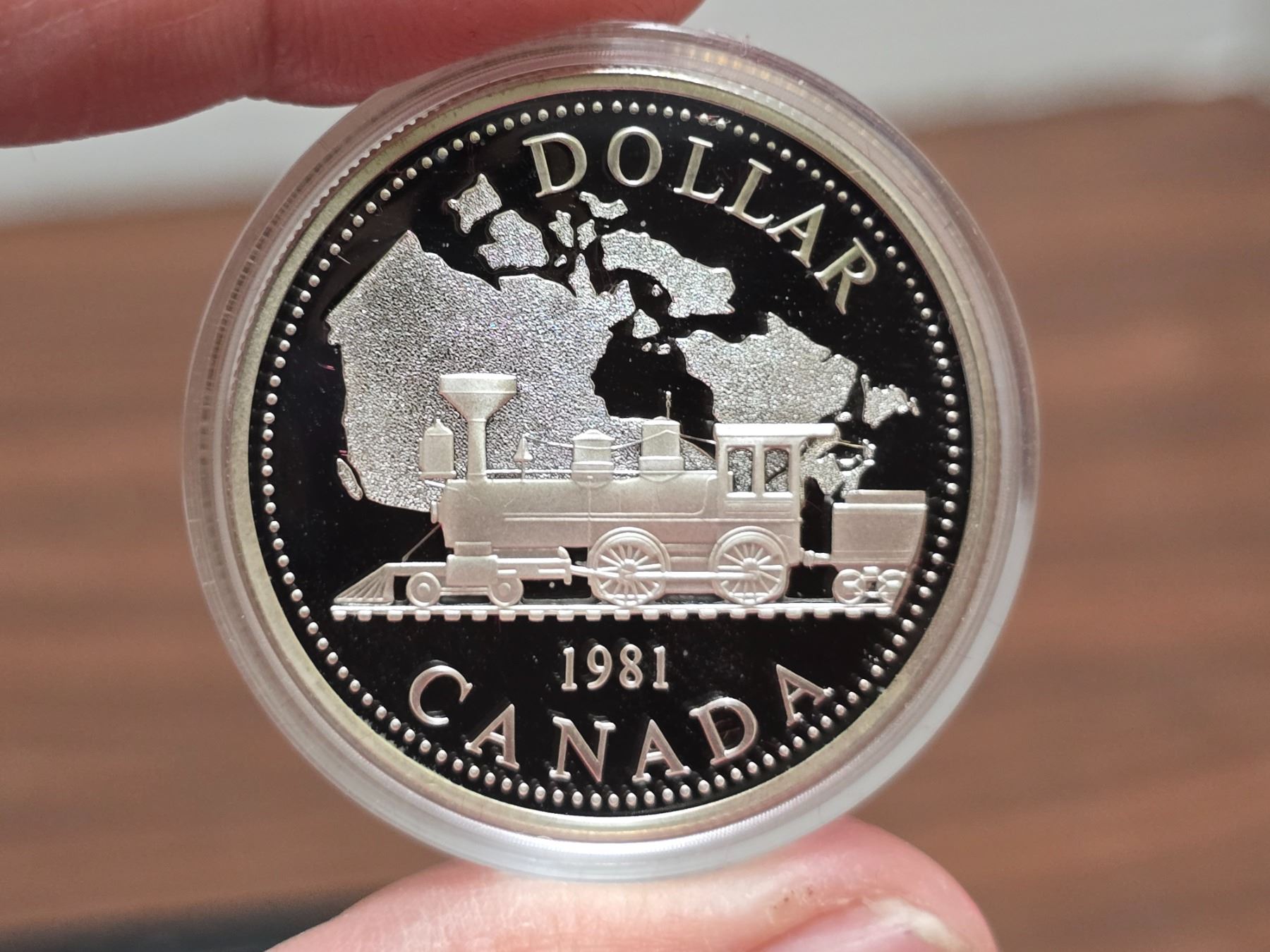 1981 Canadian "Trans-Canada Railroad" silver proof dollar, in RCM case.