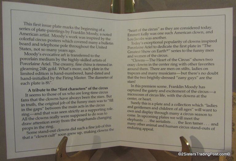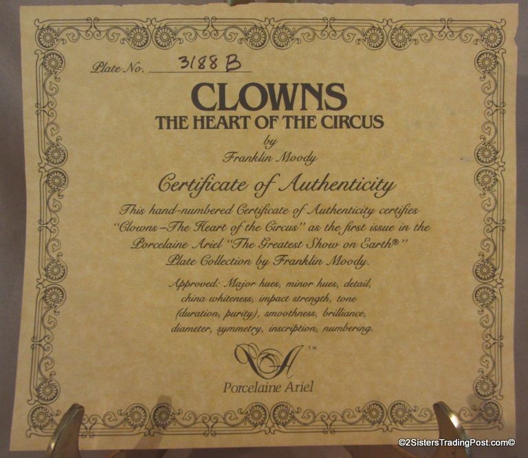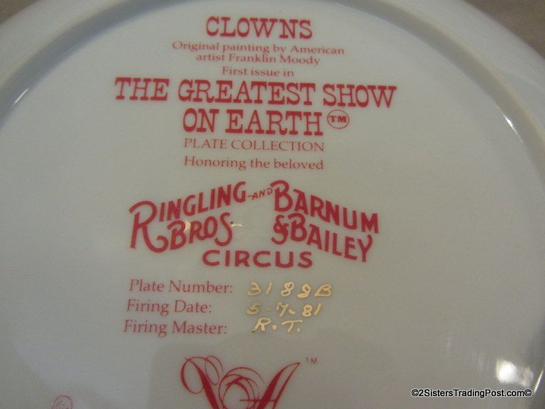 8 1/2" plate, dated 1981 'Clowns-The Heart of the Circus' this plate is first in the series of 'The Greatest Show on Earth' plate Collection by Franklin Moody. Plate 3188B firing date 5-7-1981, firing master R. T. Comes in original box with paperwork & COA. (Please see images for details).
