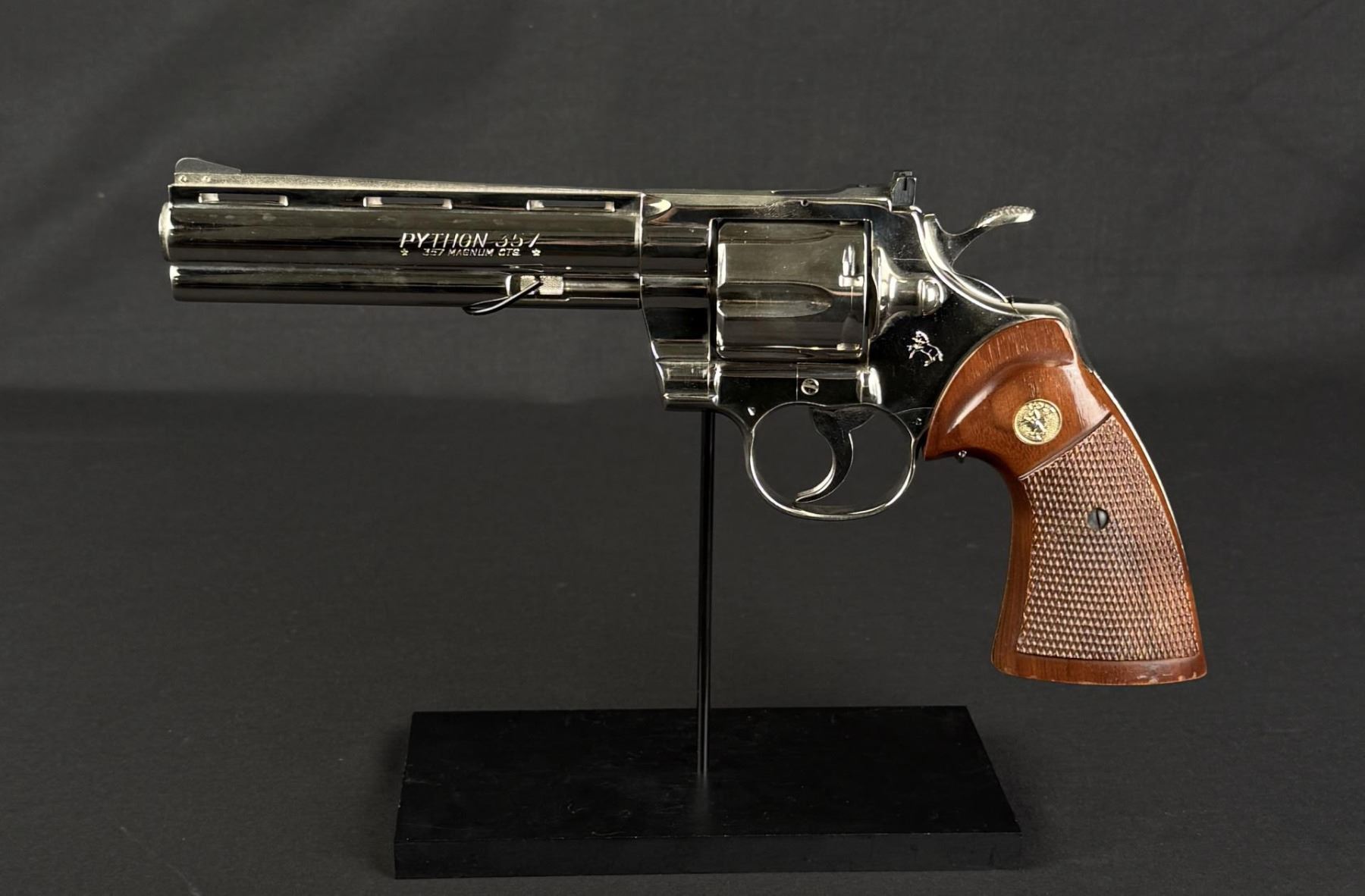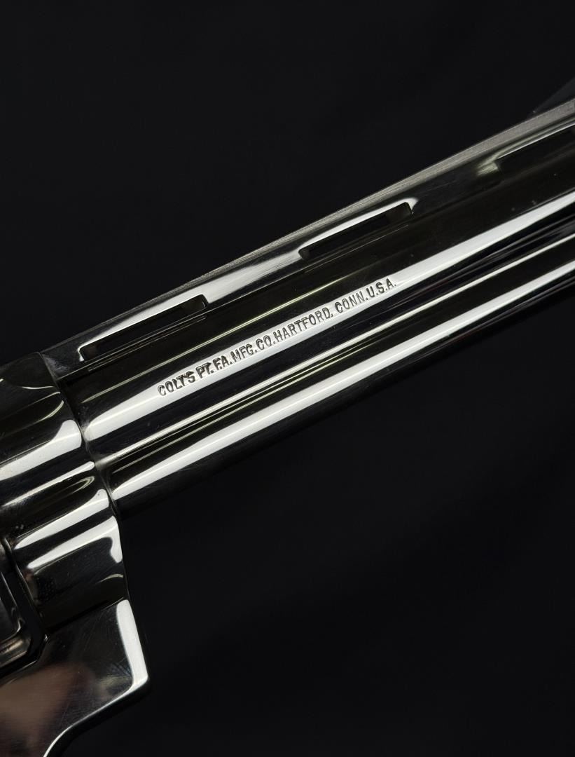 6" vent ribbed barrel with blued, pinned, ramped serrated blade front sight plus full under lug. Frame mounted blued Colt Accro rear sight. Mfg. 1981 (1955-1996) as most recognizable and desired "Snake" revolver having checkered walnut target grips with gold Colt medallions. Serrated faced trigger plus oval large spur checkered hammer; both nickel plated. Requires FFL Transfer, C&R not accepted.