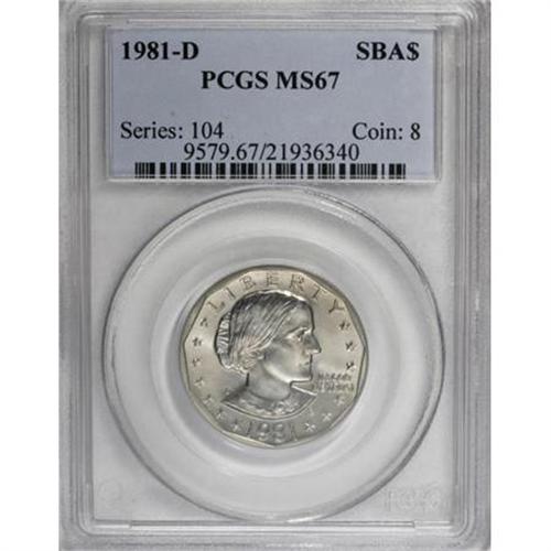 <B>1981-D SBA$ MS67 PCGS.</B></I> PCGS Population (73/0). NGC Census: (82/1). Mintage: 3,250,000. Numismedia Wsl. Price for NGC/PCGS coin in MS67: $220. (#9579)<BR><BR><b>Shipping:</b> Coins & Currency (<a target="_blank" href="http://www.heritageauctions.com/common/shipping.php">view shipping information</a>)