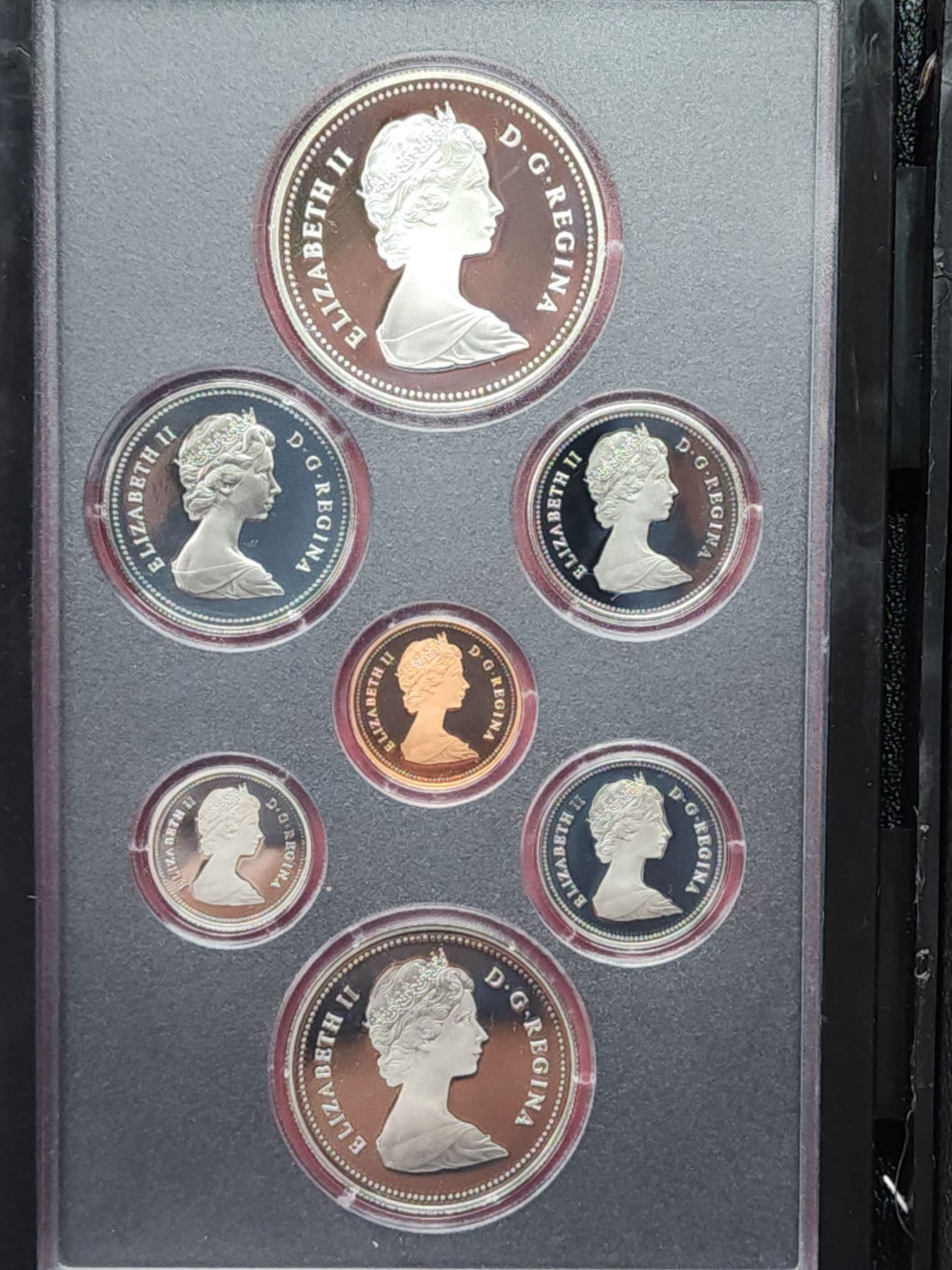 1981 Double Dollar Proof Set. Silver Dollar commemorates the 100th Anniversary of the beginning of the Trans-Canada Railway. Popular train. Silver Dollar is nicely toned. All coins have Ultra Heavy Cameos. Housed in its original Royal Canadian Mint case of issue. Includes Certificate of Authenticity.