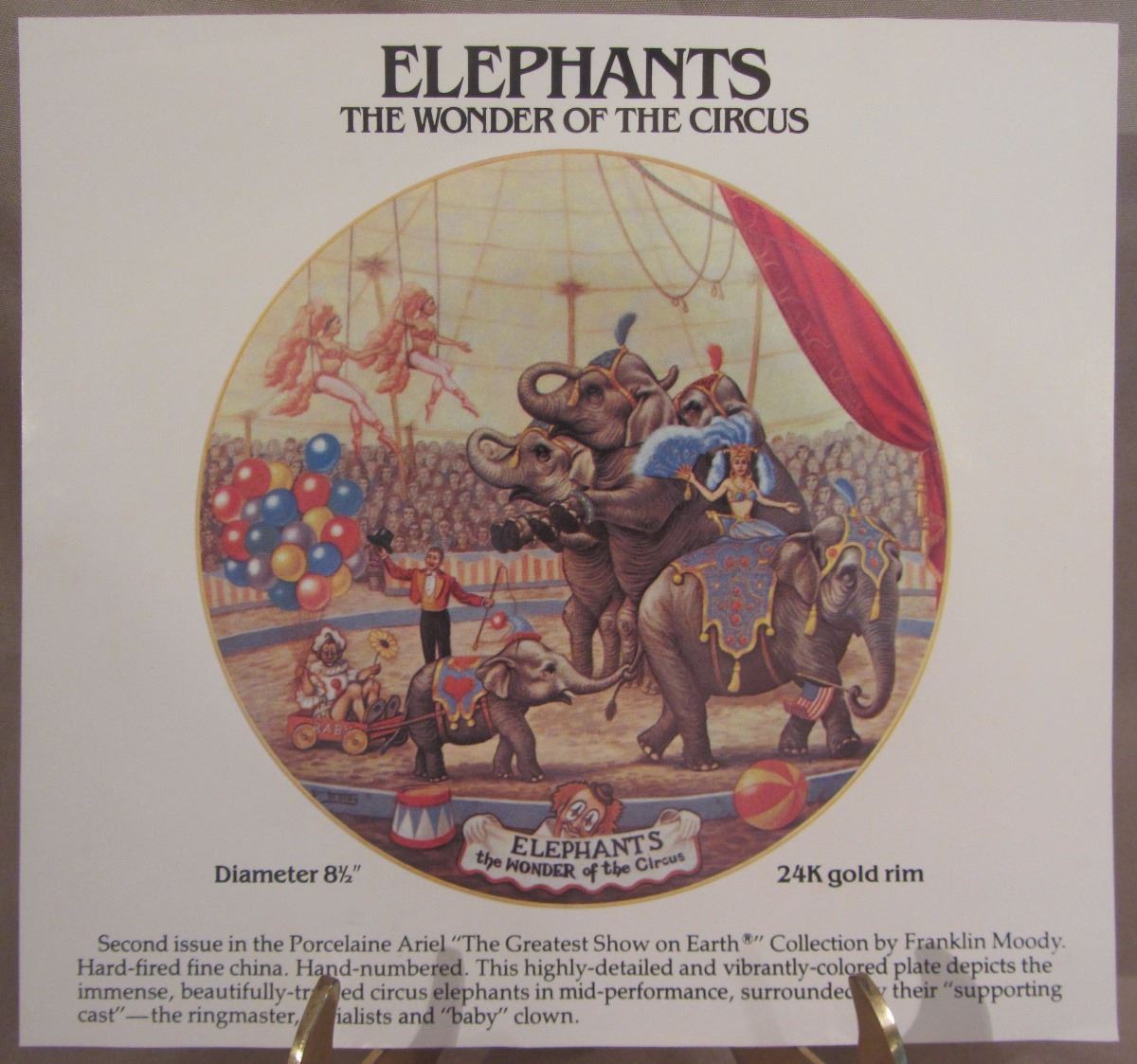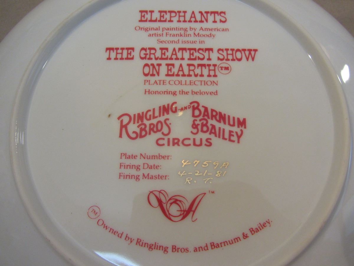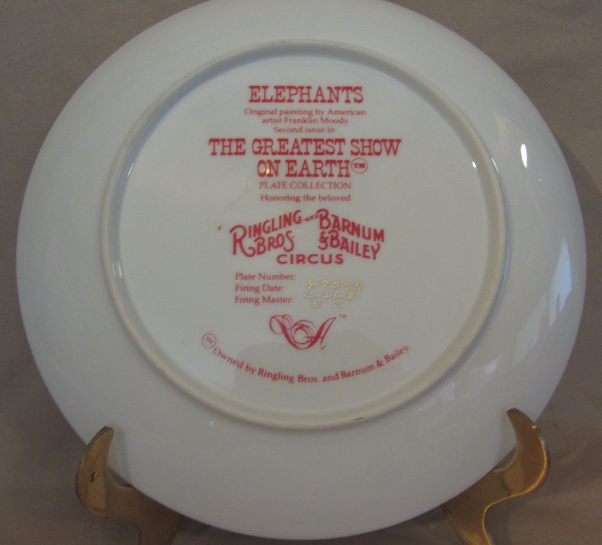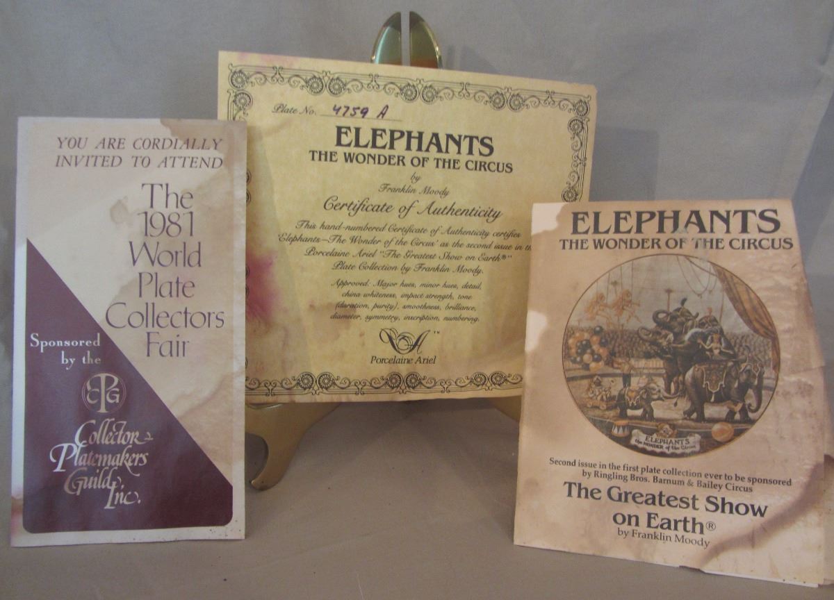 8 1/2" plate, dated 1981 'Elephants' second in the series of 'The Greatest Show on Earth' plate Collection by Franklin Moody. Plate 4759A, firing date 4-21-1981, firing master R. T. Has original paperwork with COA. (Please see images for details).