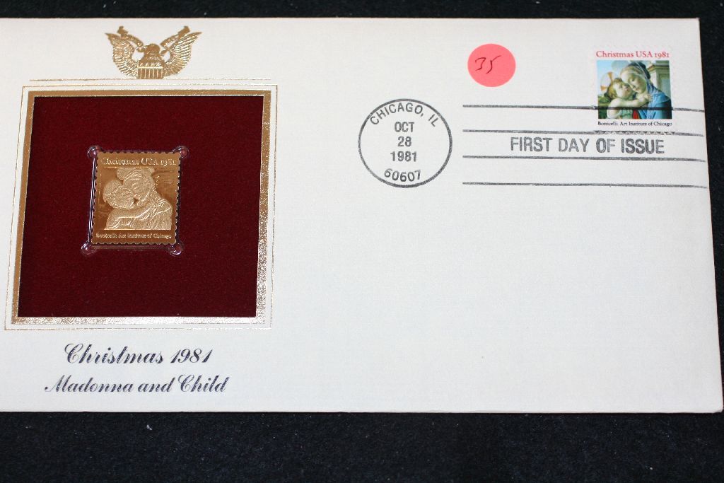 1981 First Day of Issue 22K Gold Replica Stamp W/Postal Stamp; Christmas 1981 Madonna and Child
