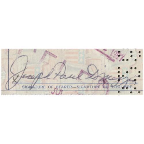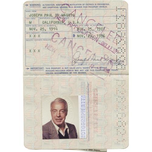 <B>1981 Joe DiMaggio Signed Passport.</B></I> Official government issue is packed with stamps that document visits to places like South Africa, the Dominican Republic and Japan. Best, however, is the two-page spread that features the Yankee Clipper's personal information, with rare "Joseph Paul DiMaggio" autograph in 10/10 ink, and a smiling snapshot of the legend. For collectors who demand unquestionable authenticity, you just can't do better than this. Letter of provenance from the DiMaggio family signed by both granddaughters is included.. <I>LOA from PSA/DNA. LOA from James Spence Authentication.</B></I><BR><BR><b>Shipping:</b> Flat Material, Small (<a target="_blank" href="http://www.heritageauctions.com/common/shipping.php">view shipping information</a>)