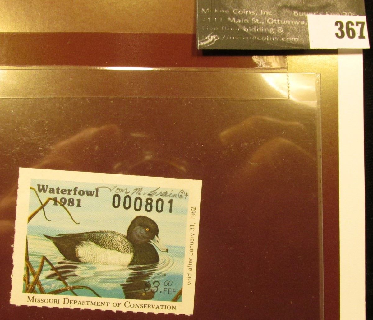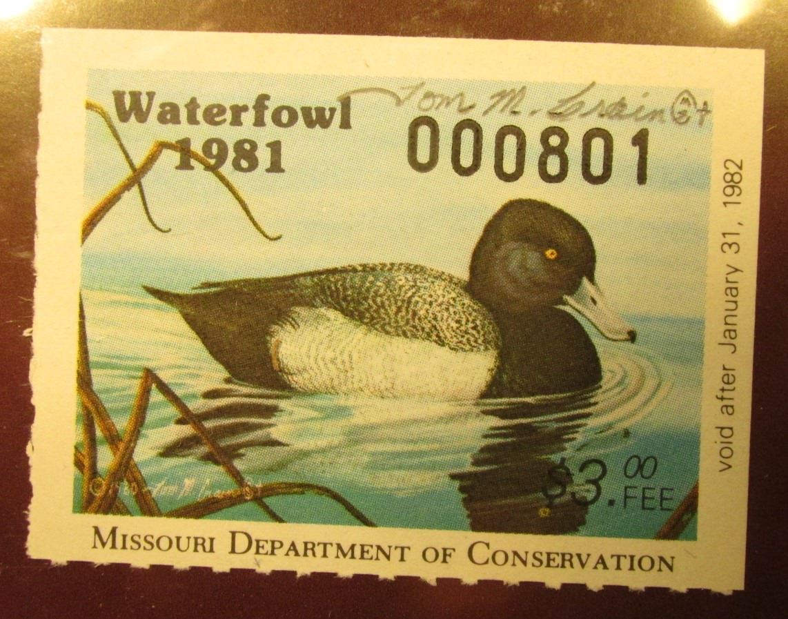 1981 Missouri Migratory Waterfowl Stamp, MO3, Signed by Artist Tom Crain, VF, NH. Lesser Scaup.