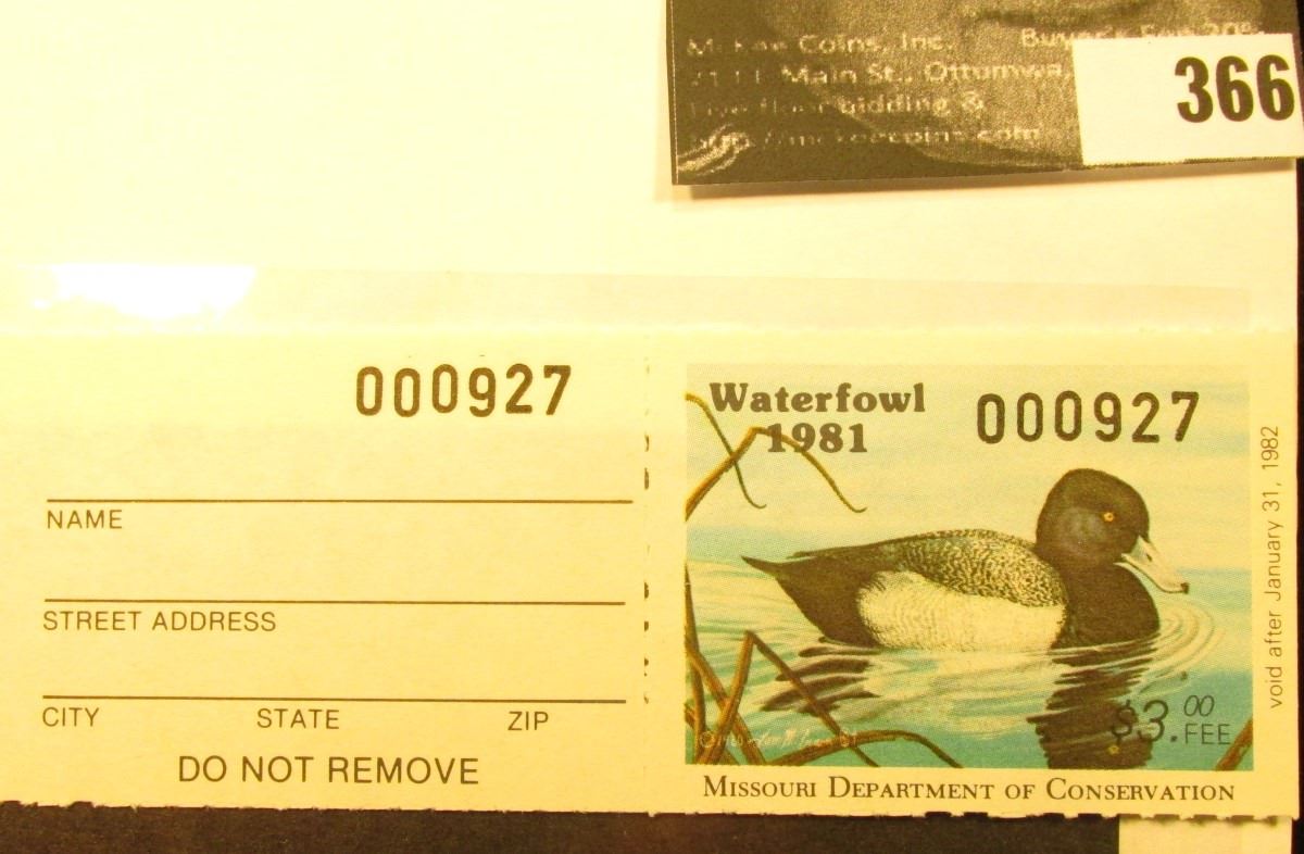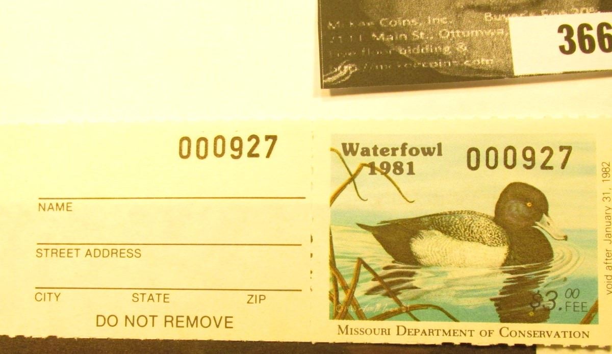 1981 Missouri Migratory Waterfowl Stamp, MO3a, unsigned, VF, NH. Lesser Scaup.