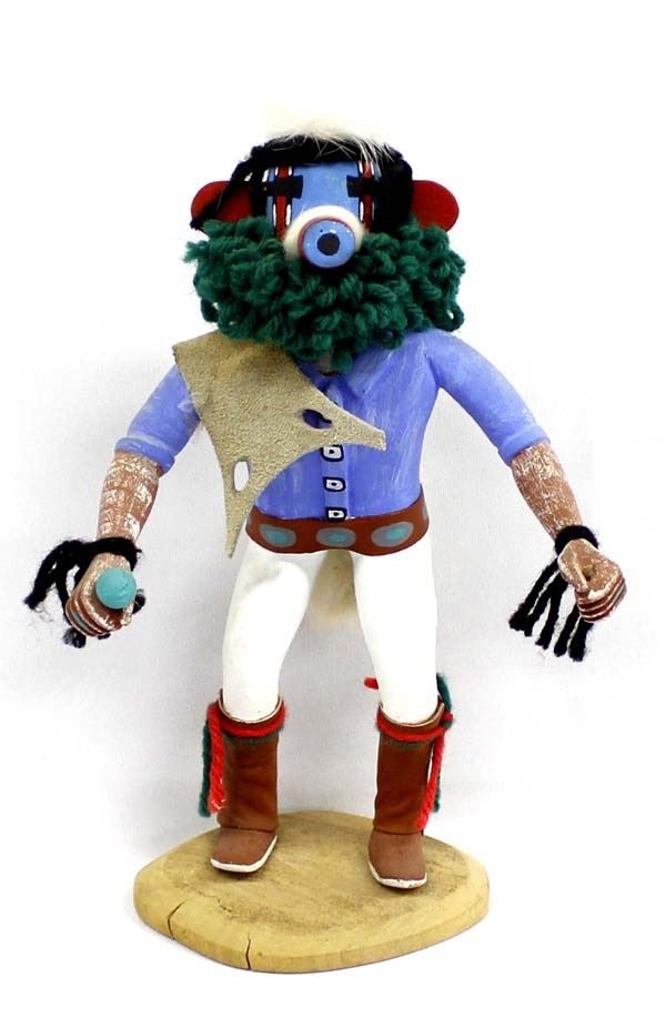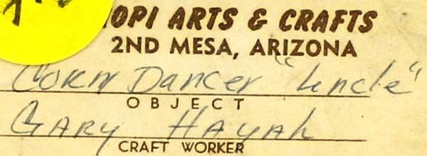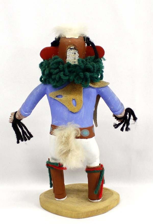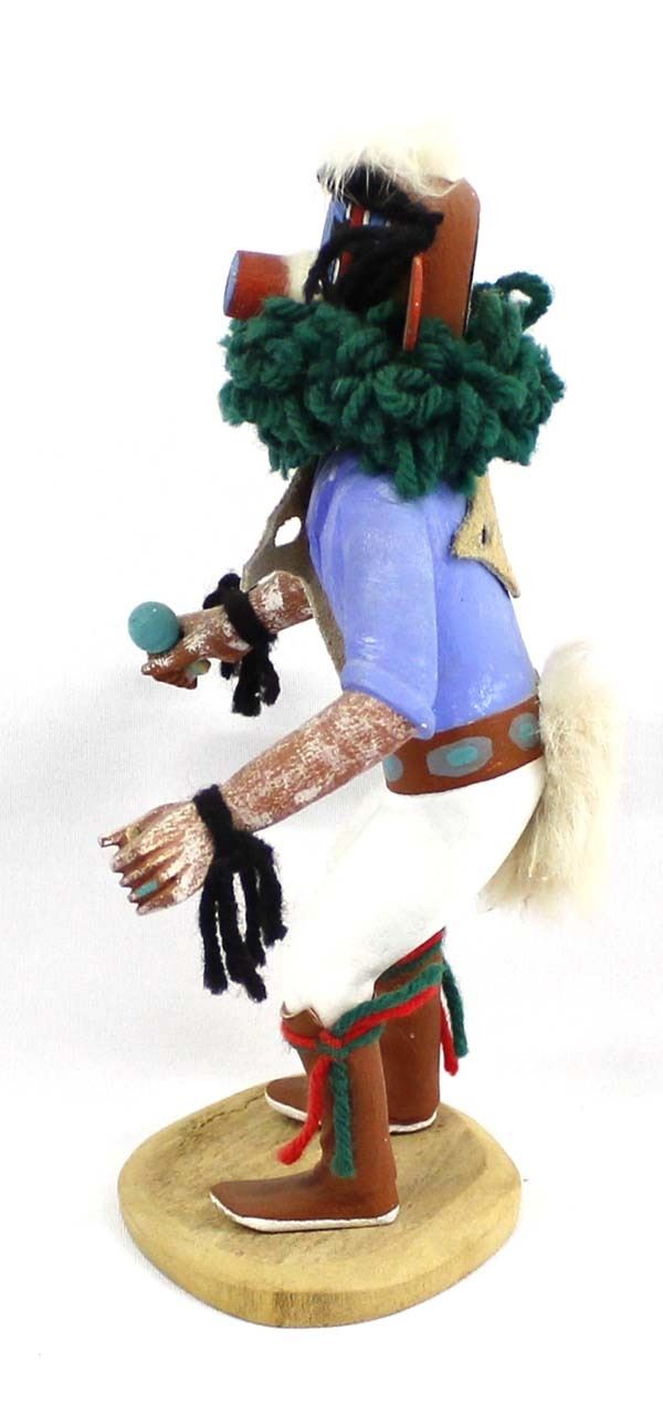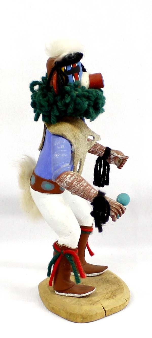 1981 Native American Hopi Corn Dancer by Gary Hayah of 2nd Mesa, measures 10'' x 6'' x 3'', has informational card on the bottom, embellished with yarn, rabbit fur, and leather