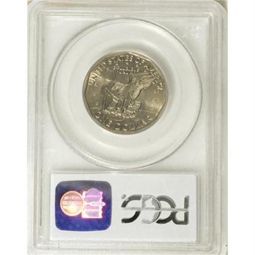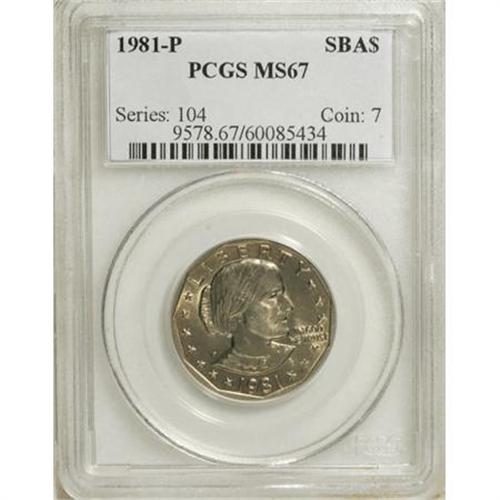 <B>1981-P SBA$ MS67 PCGS.</B></I> This satiny Superb Gem is immaculate aside from nearly imperceptible contact on the upper right portion of Anthony's dress. A sharp strike that is incomplete only between the jaw and cheekbone. Lightly toned in olive-gold. Struck for mint sets only, unlike the much higher productions of 1979 and 1980. Population: 16 in 67, 0 finer (2/08).<BR><BR><b>Shipping:</b> Coins & Currency (<a target="_blank" href="http://www.heritageauctions.com/common/shipping.php">view shipping information</a>)