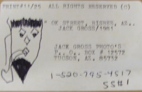 1981 Photo OK Street Bisbee Arizona by Jack Gross, on back Print 11/25, measures approx. 7.5'' x 9.5''. SHI $20.