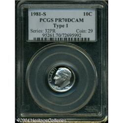 1981-S 10C Type One PR70 Deep Cameo PCGS. Radiant <B>1981-S 10C Type One PR70 Deep Cameo PCGS.</B></I> Radiant white devices provide unlimited contrast with the pristine, glass-like fields. The strike is pinpoint sharp, and the quality is unimprovable. Population: 42 in 70 (11/04). <BR><BR><B>Important notice:</B> Heritage usually auctions material at the rate of 200-250 lots per hour. On some occasions eBay Live bid software or the Internet may not be able to keep up with the pace of the auction. We recommend placing a realistic absentee bid now as insurance to avoid disappointment. Occasionally the auctioneer may eliminate or reject an eBay Live bid, and the auctioneer may also reopen a lot after the close of the eBay live bidding (usually because we missed an audience bid), and may reject your bid even if it shows you as the winning bidder. By bidding via eBay Live, you agree that Heritage may award the lot to another bidder at its sole discretion under the circumstances described above or any other reasonable circumstances. Since eBay bids are not shown to us until we open the lot on the floor, we treat those bids just like floor bids. In most cases the floor responds before the eBay bid is presented to us, due to Internet lag time, so for consistency we have made it a policy that floor bids are always considered first over tie eBay live bids. Also please note that all Heritage lots purchased through eBay Live carry a 20% Buyer's Premium. Please make sure you read the Terms and Conditions before you bid. This lot is being auctioned in conjunction with a live floor auction by Heritage Galleries & Auctioneers. All final auction and invoice information will be supplied by Heritage Galleries & Auctioneers, and all other information should be considered preliminary. Lot:5860
