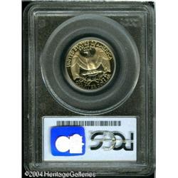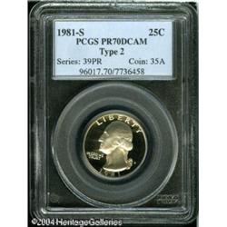 1981-S 25C Type Two PR70 Deep Cameo PCGS. Rich hon <B>1981-S 25C Type Two PR70 Deep Cameo PCGS.</B></I> Rich honey color visits the reverse border, although this fully struck specimen is otherwise brilliant. A curly mint-made lintmark is on Washington's Adam's Apple. Population: 19 in 70 (10/04). <BR><BR><B>Important notice:</B> Heritage usually auctions material at the rate of 200-250 lots per hour. On some occasions eBay Live bid software or the Internet may not be able to keep up with the pace of the auction. We recommend placing a realistic absentee bid now as insurance to avoid disappointment. Occasionally the auctioneer may eliminate or reject an eBay Live bid, and the auctioneer may also reopen a lot after the close of the eBay live bidding (usually because we missed an audience bid), and may reject your bid even if it shows you as the winning bidder. By bidding via eBay Live, you agree that Heritage may award the lot to another bidder at its sole discretion under the circumstances described above or any other reasonable circumstances. Since eBay bids are not shown to us until we open the lot on the floor, we treat those bids just like floor bids. In most cases the floor responds before the eBay bid is presented to us, due to Internet lag time, so for consistency we have made it a policy that floor bids are always considered first over tie eBay live bids. Also please note that all Heritage lots purchased through eBay Live carry a 20% Buyer's Premium. Please make sure you read the Terms and Conditions before you bid. This lot is being auctioned in conjunction with a live floor auction by Heritage Galleries & Auctioneers. All final auction and invoice information will be supplied by Heritage Galleries & Auctioneers, and all other information should be considered preliminary. Lot:6021