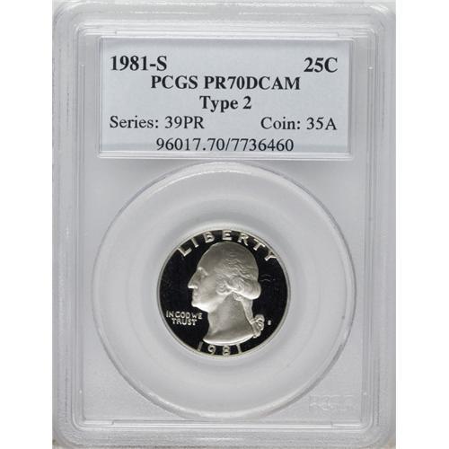<B>1981-S 25C Type Two PR70 Deep Cameo PCGS.</B></I> The Type Two is the scarcer "clear S" variety, perhaps best distinguished by the larger, bulbous upper serif of the mintmark. Unimprovable surfaces project a "white-on-black" appearance as the coin is viewed from a direct overhead angle. Fantastic technical quality and aesthetic appeal.<BR><BR><b>Shipping:</b> Coins & Currency (<a target="_blank" href="http://www.heritageauctions.com/common/shipping.php">view shipping information</a>)