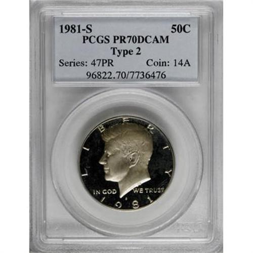 <B>1981-S 50C Type Two PR70 Deep Cameo PCGS.</B></I> Fully struck with attractive copper-gold toning and intense Deep Cameo contrast on both sides. Virtually pristine, with mere traces of cloudiness noted in the fields. The bulbous upper serif helps to distinguish the Type Two mintmark from its Type One counterpart. Population: 24 in 70 Deep Cameo (8/07). <BR><BR><b>Shipping:</b> Coins & Currency (<a target="_blank" href="http://www.heritageauctions.com/common/shipping.php">view shipping information</a>)