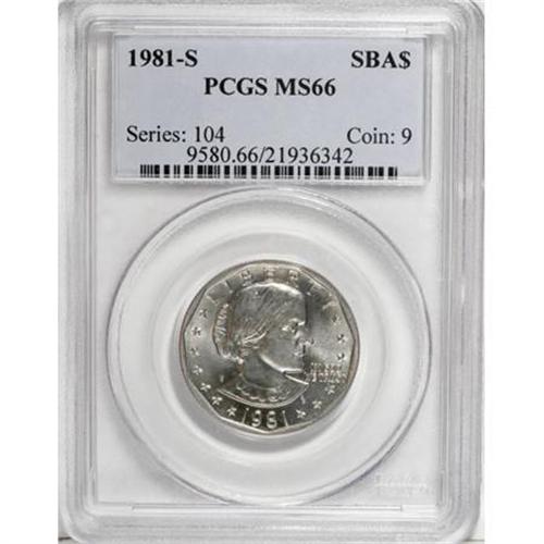 <B>1981-S SBA$ MS66 PCGS.</B></I> PCGS Population (100/1). NGC Census: (49/4). Mintage: 3,492,000. Numismedia Wsl. Price for NGC/PCGS coin in MS66: $220. (#9580)<BR><BR><b>Shipping:</b> Coins & Currency (<a target="_blank" href="http://www.heritageauctions.com/common/shipping.php">view shipping information</a>)