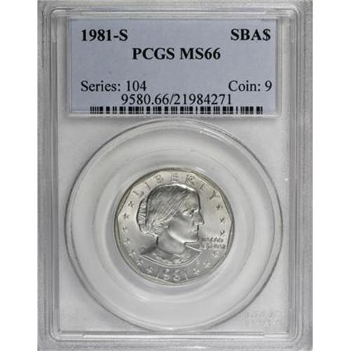 <B>1981-S SBA$ MS66 PCGS.</B></I> PCGS Population (101/1). NGC Census: (50/4). Mintage: 3,492,000. Numismedia Wsl. Price for NGC/PCGS coin in MS66: $220. (#9580)<BR><BR><b>Shipping:</b> Coins & Currency (<a target="_blank" href="http://www.heritageauctions.com/common/shipping.php">view shipping information</a>)