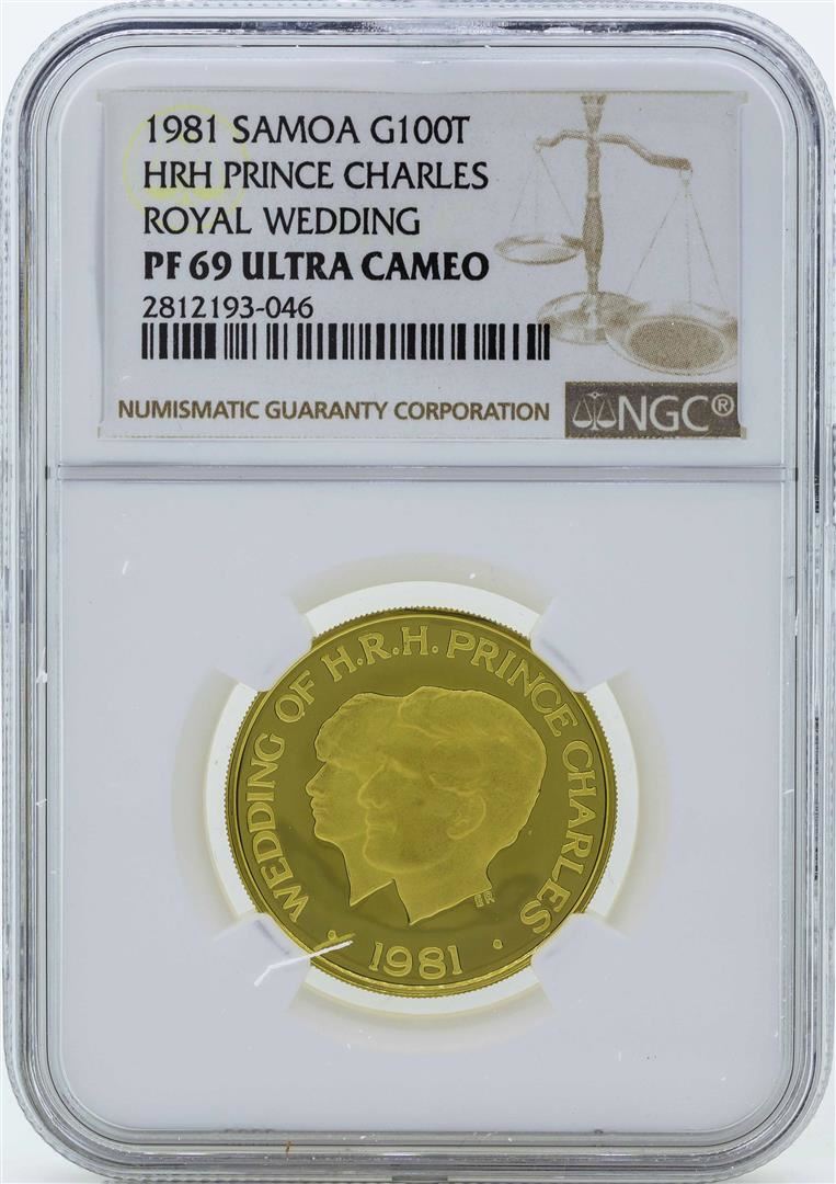 One 1981 Samoa 100 Tala Prince Charles Royal Wedding Gold Coin NGC PF69 Ultra Cameo. NGC Certified.