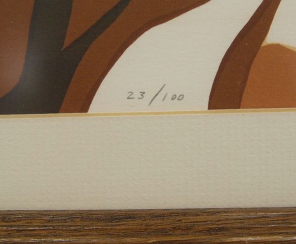 1981 Signed and Numbered 23/100 Print by Jon Lightfoot, framed under glass and matted, signed and dated in lower right corner, numbered in lower middle, visual measures 30'' x 22'', wood frame, Artist Bio: Jon Lightfoot (1930- ) was born in 1939 in Kansas City, Missouri. to a Cherokee father and a Swedish mother. He attended grade school on the Cherokee reservation in Oklahoma and high school in Tucson, Arizona. He later moved to New York, where he pursued his primary interest, theater and commercial art. He studied under modernist painter Lowell Nesbitt for three years, then traveled to Italy and began painting figures. Lightfoot returned to Tucson in 1971 and by 1974 he was devoting all of his time to painting, developing a personal style of painting which incorporated realistic Native American faces with abstracted backdrops and blanket designs. Jon Lightfoot has been featured in Art of the West and Southwest Art magazines.