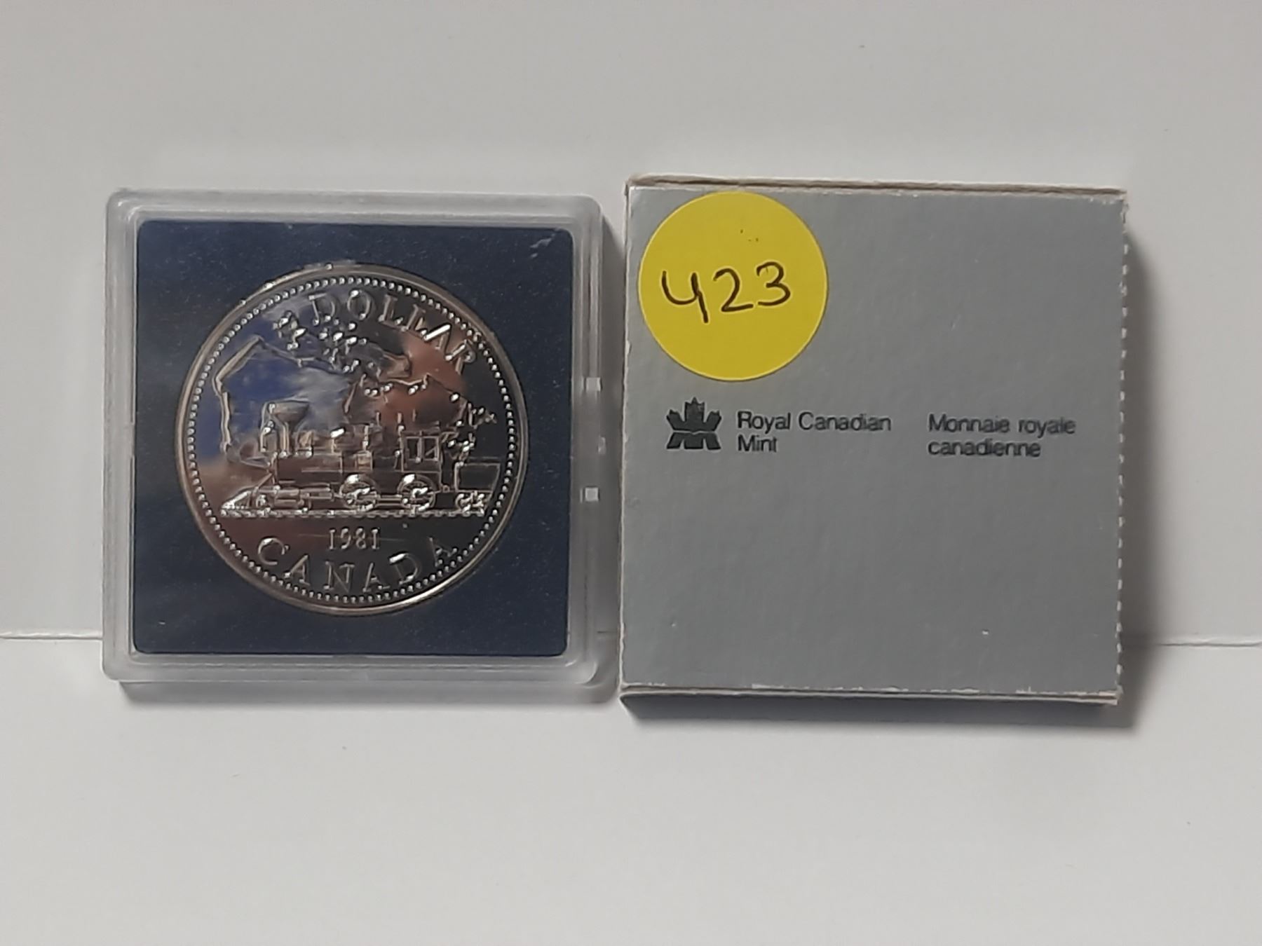 1981 Specimen Silver Dollar. Commemorates the beginning of the Trans-Canada Railway by the CPR. Housed in its original hard plastic case.