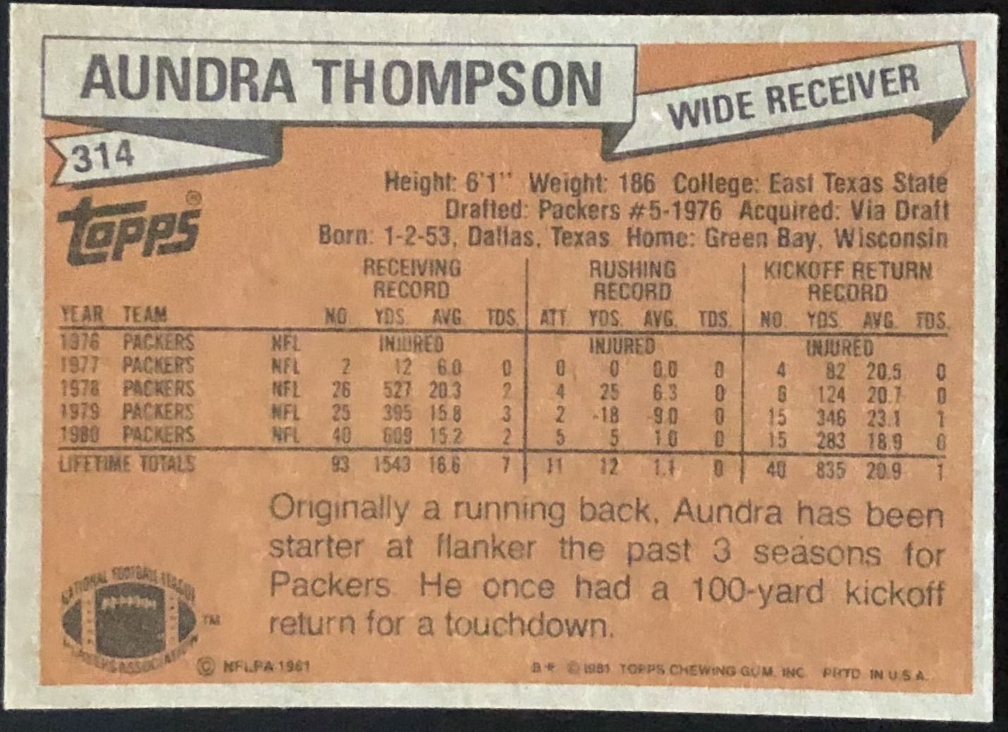Card #314 NFL, football, vintage, rookie
