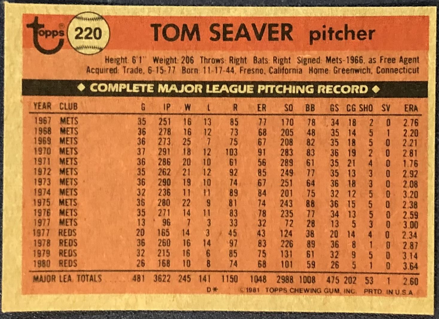 Card #220 MLB, baseball, vintage, hall of fame