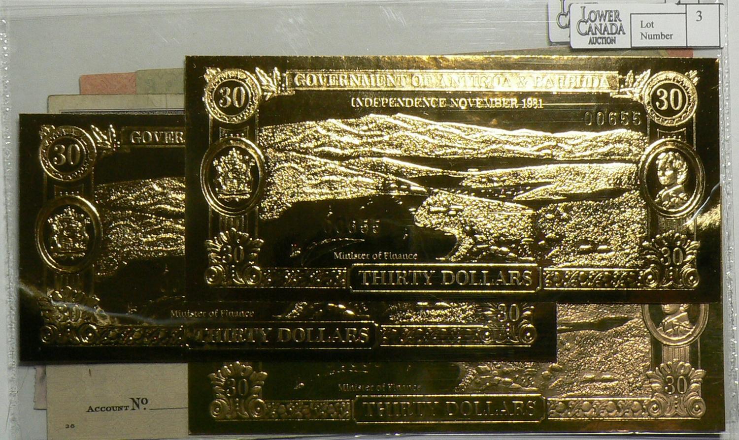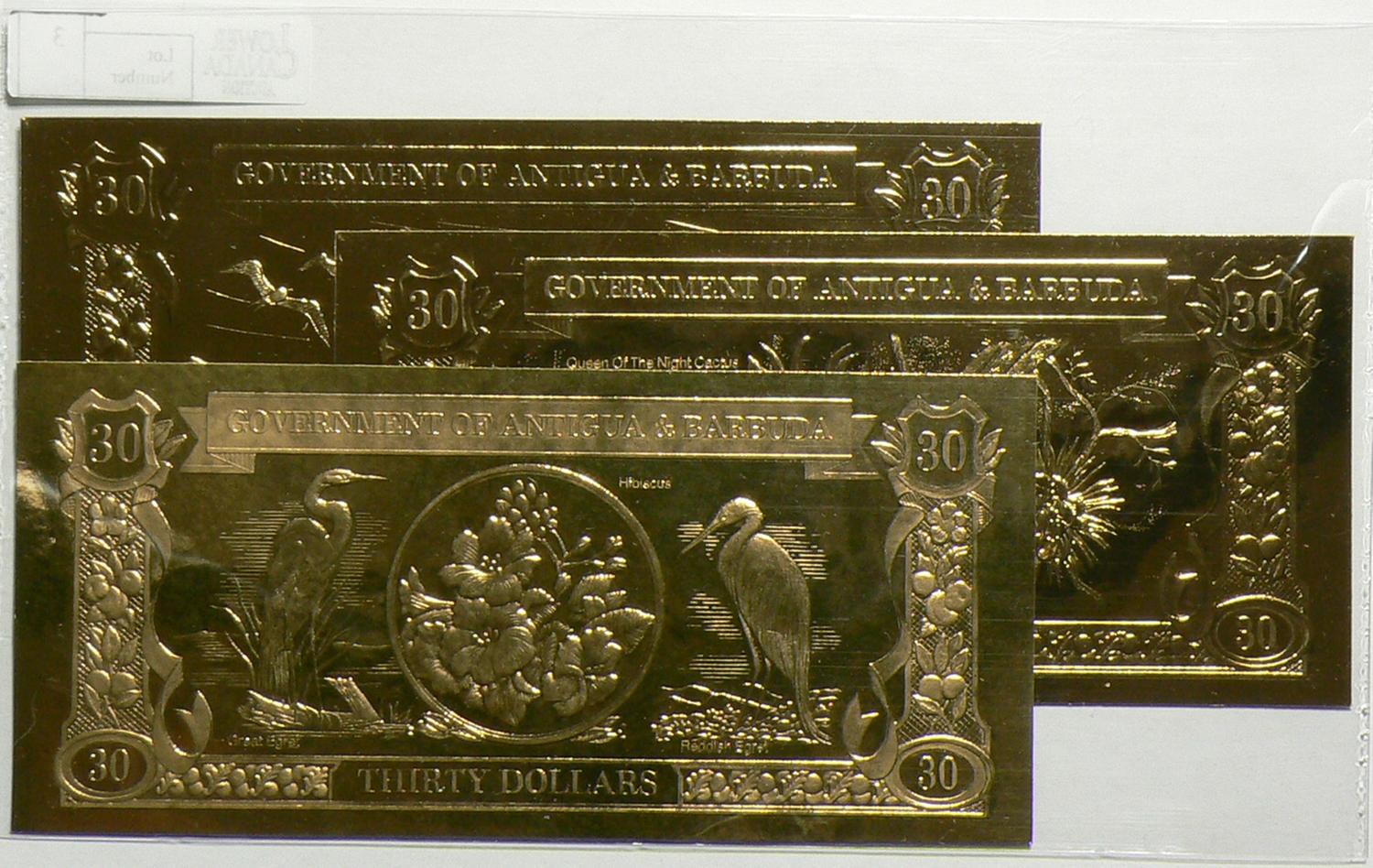 1981, Thirty Dollars Government of Antigua & Barbuda, lot of 3 notes gold plated.