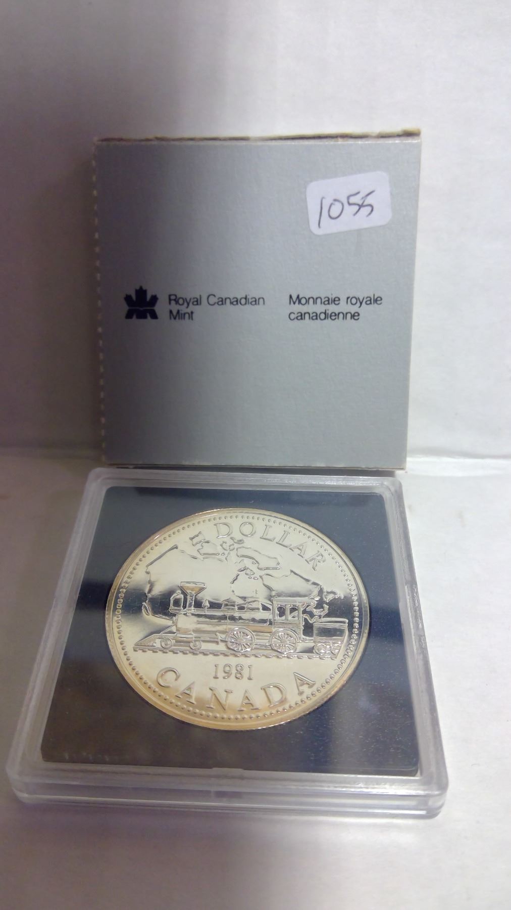 1981 Trans-Canada Railway Centennial Specimen Silver Dollar. In case and box of issue.