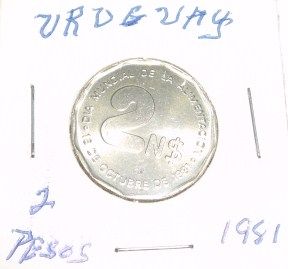 1981 URUGUAY 2 PESOS *RARE MS HIGH GRADE**!! ***Coin, Currency & All Items Listed in this auction - Grades, Conditions and Values are not Safe Deposit Coins LLC Responsibilty. Grades, Condition and Values are determined by Consigner(s) & Buyers ONLY***