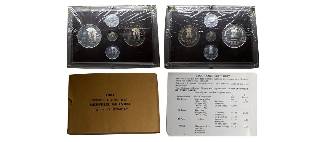 1981, World Food Day, Proof set of 4 Coins, 100 Rupees, 10 Rupees, 25 Paise and 10 Paise, Bombay Mint, RB 83, in original mint packing.