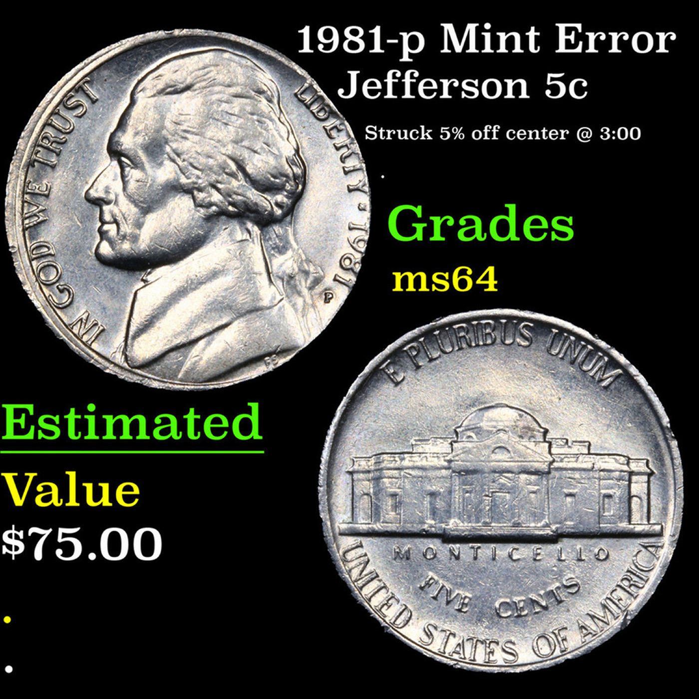 1981-p Mint Error Jefferson Nickel 5c Grades Choice Unc.