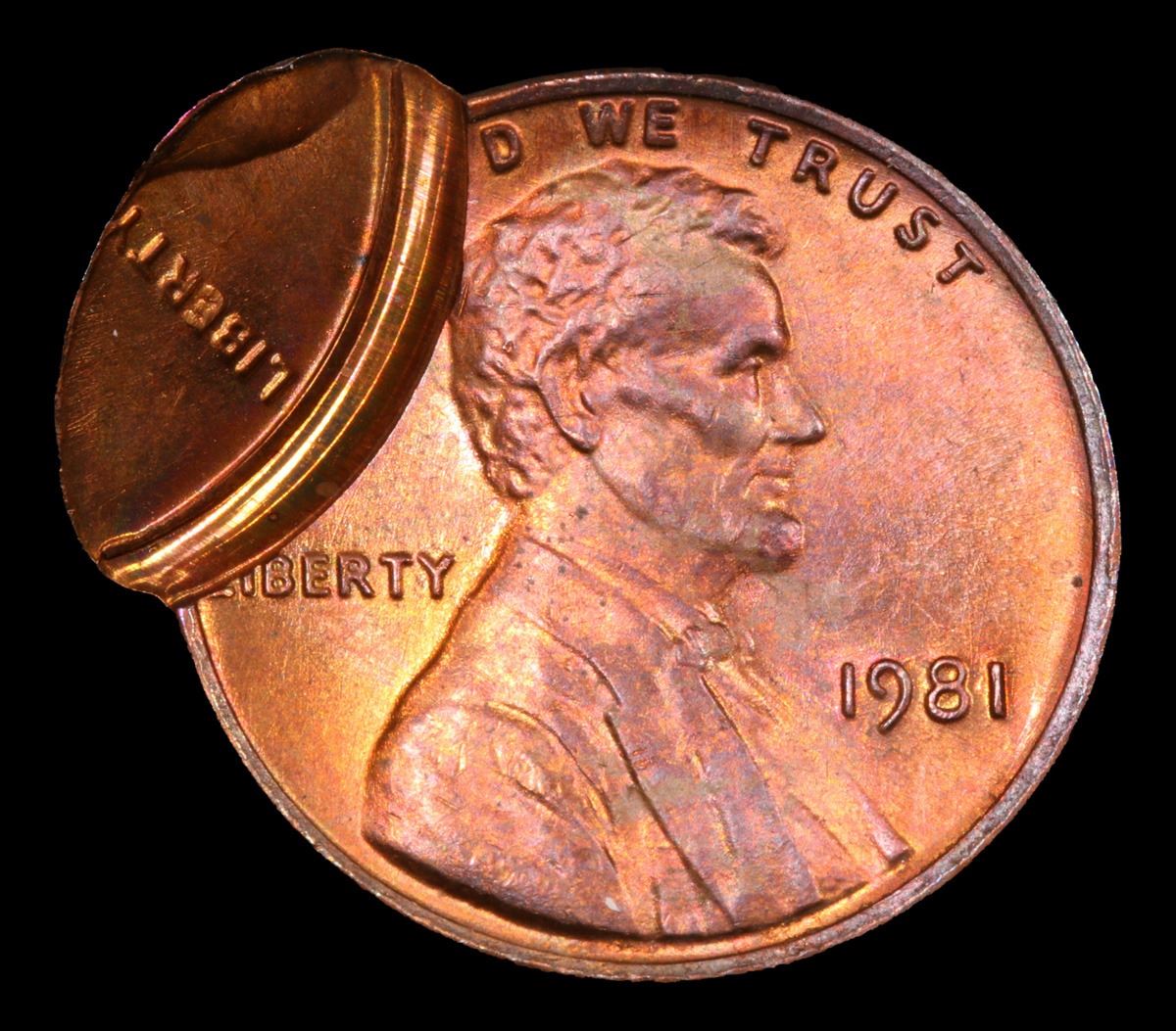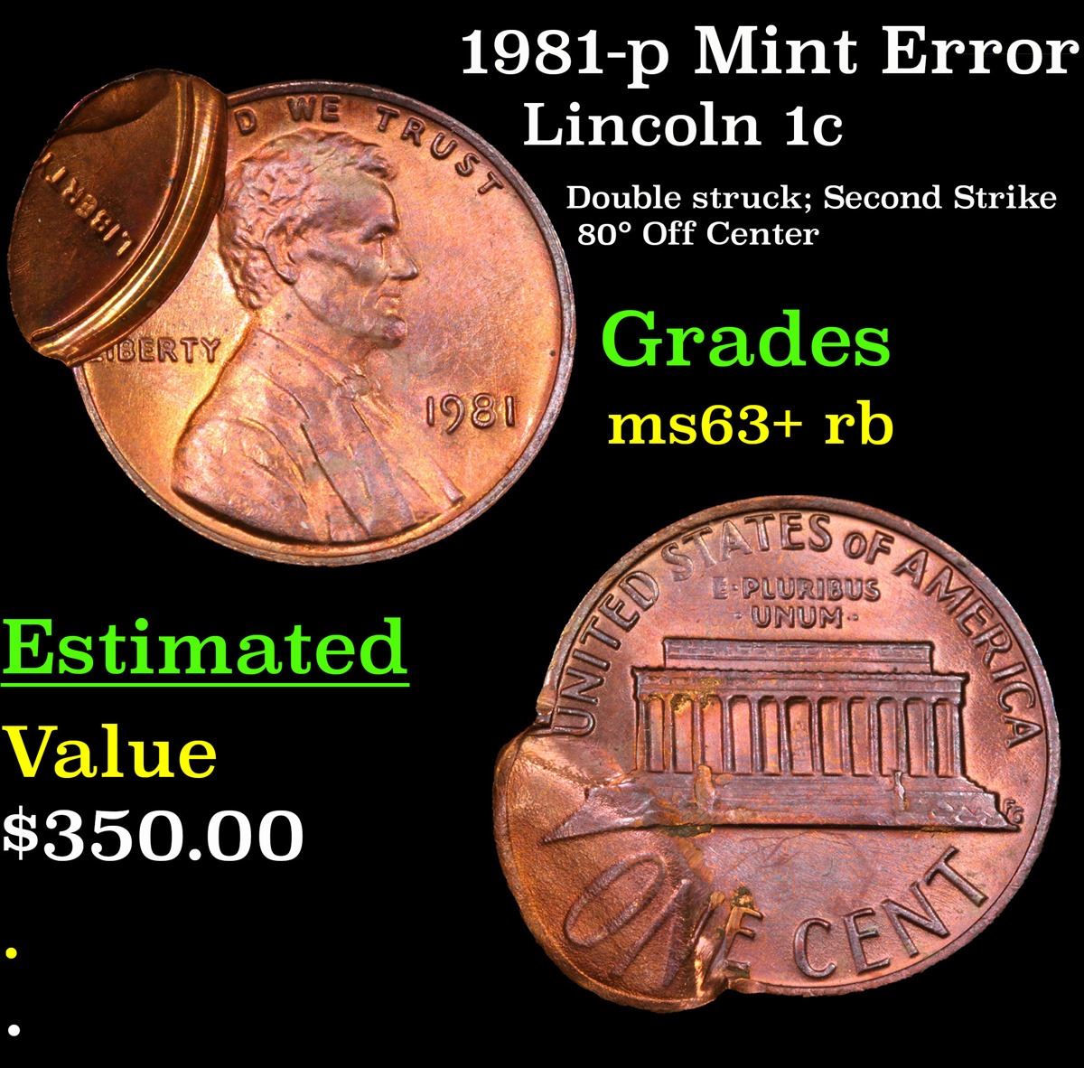 1981-p Mint Error Double struck; Second Strike 80° Off Center . Lincoln Cent 1c Grades Select+ Unc RB. A Corey's Pick