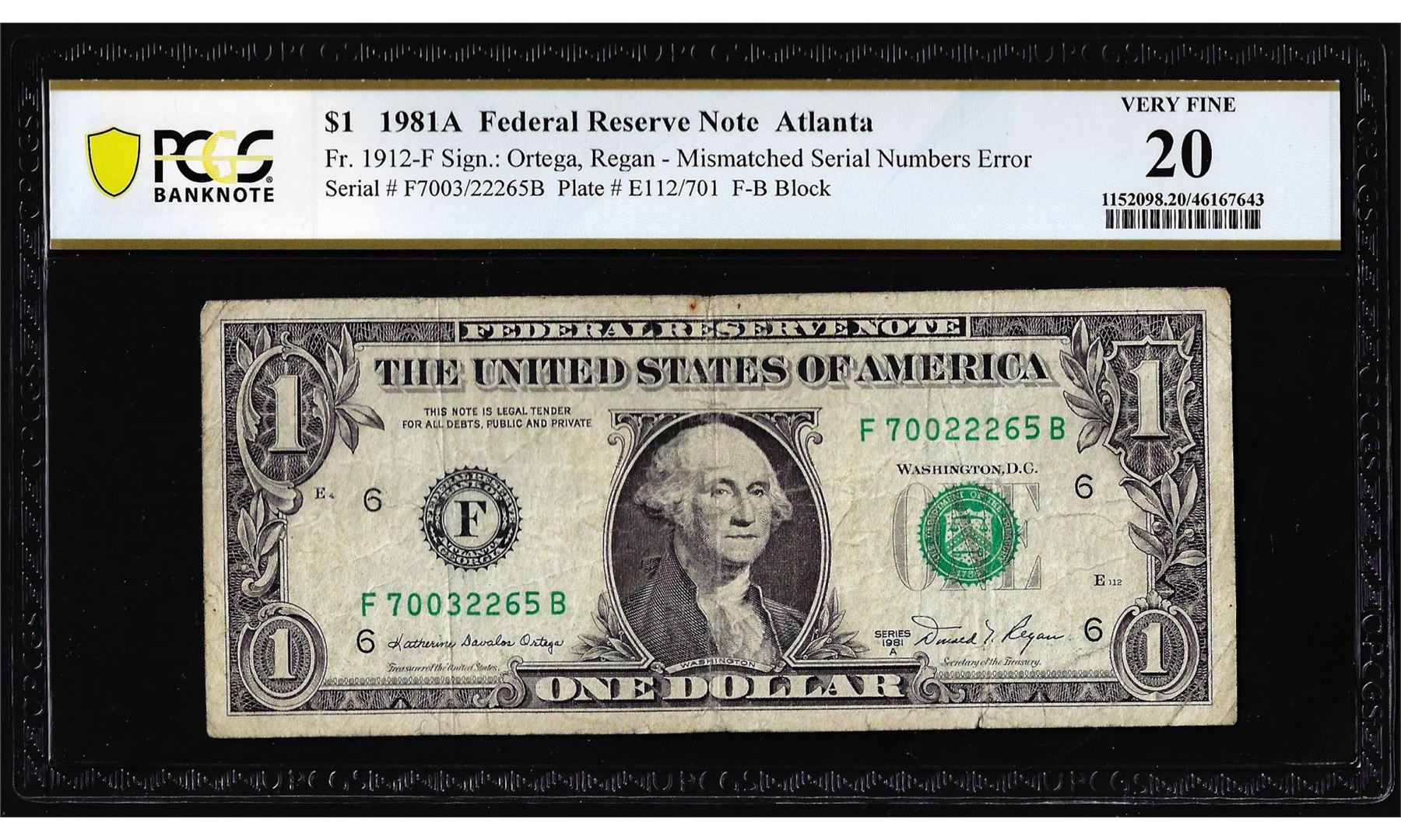 One 1981A $1 Federal Reserve Note Mismatched Serial Number Error Fr.1912-F PCGS Very Fine 20. PCGS Graded.