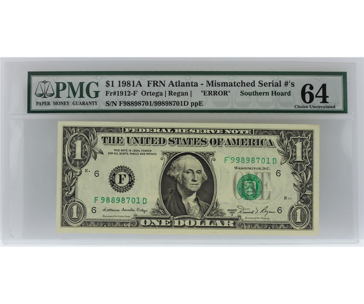 One 1981A FRN Atlanta $1 Mismatched S/N Error Federal Reserve Note FR-1912-F PMG Graded Choice Uncirculated 64. PMG Appraised.