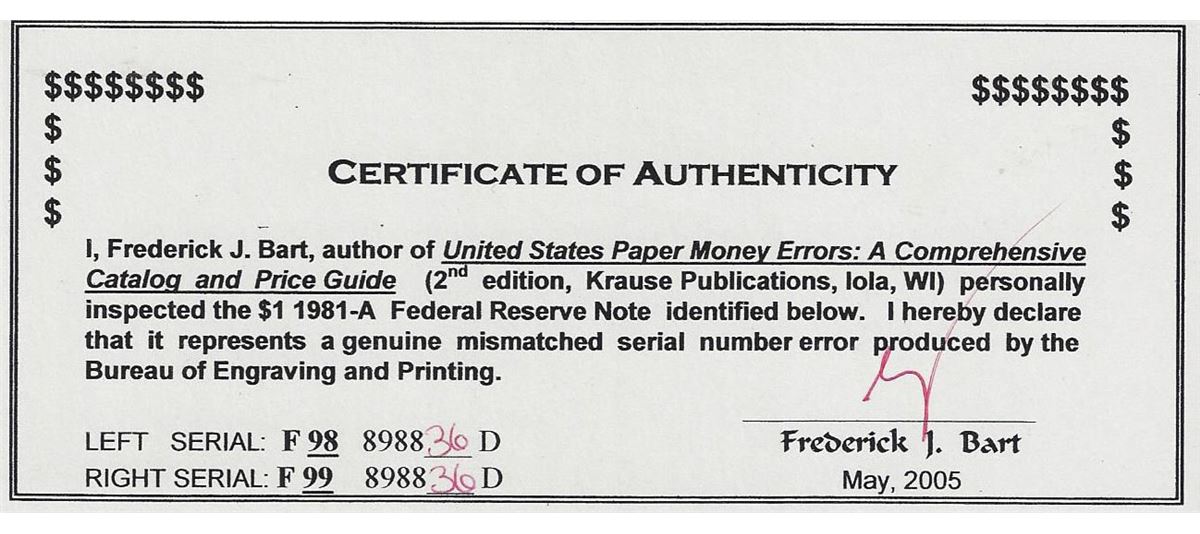 One 1981A $1 Mismatched S/N Error Federal Reserve Note.