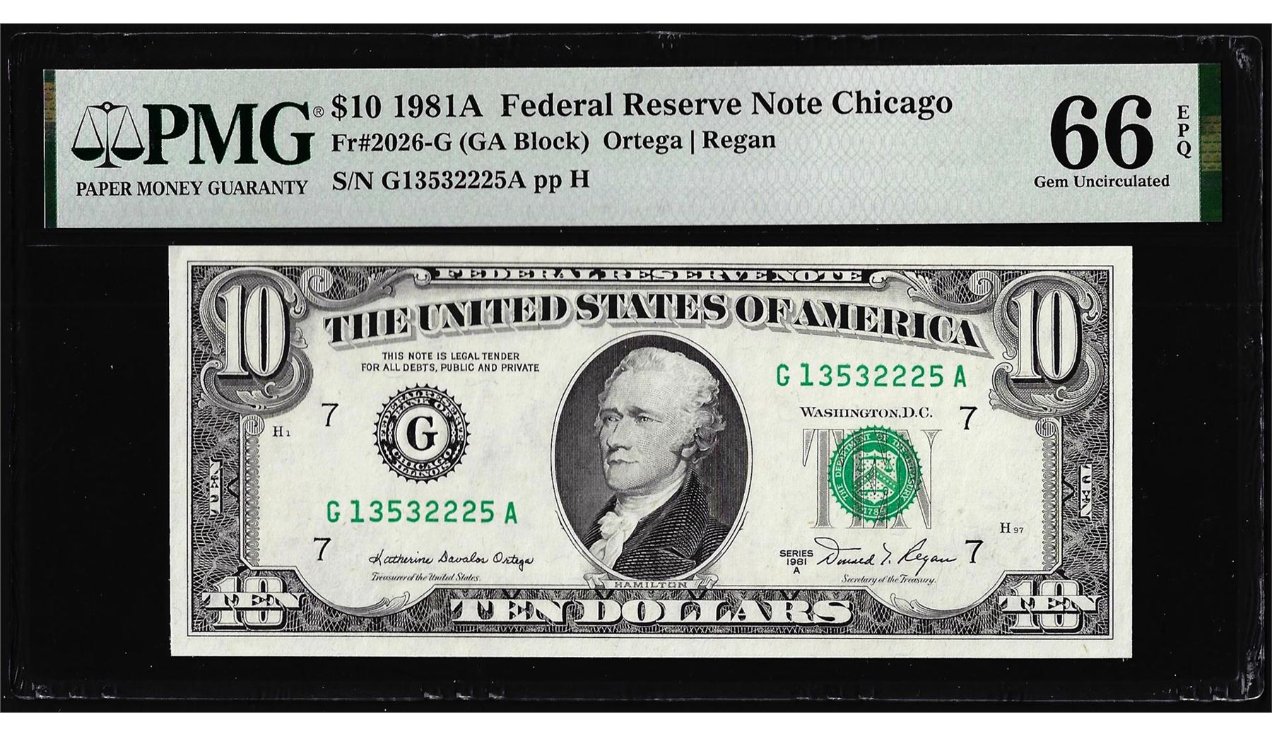 One 1981A $10 Federal Reserve Note Chicago Fr.2026-G PMG Gem Uncirculated 66EPQ. PMG Certified.