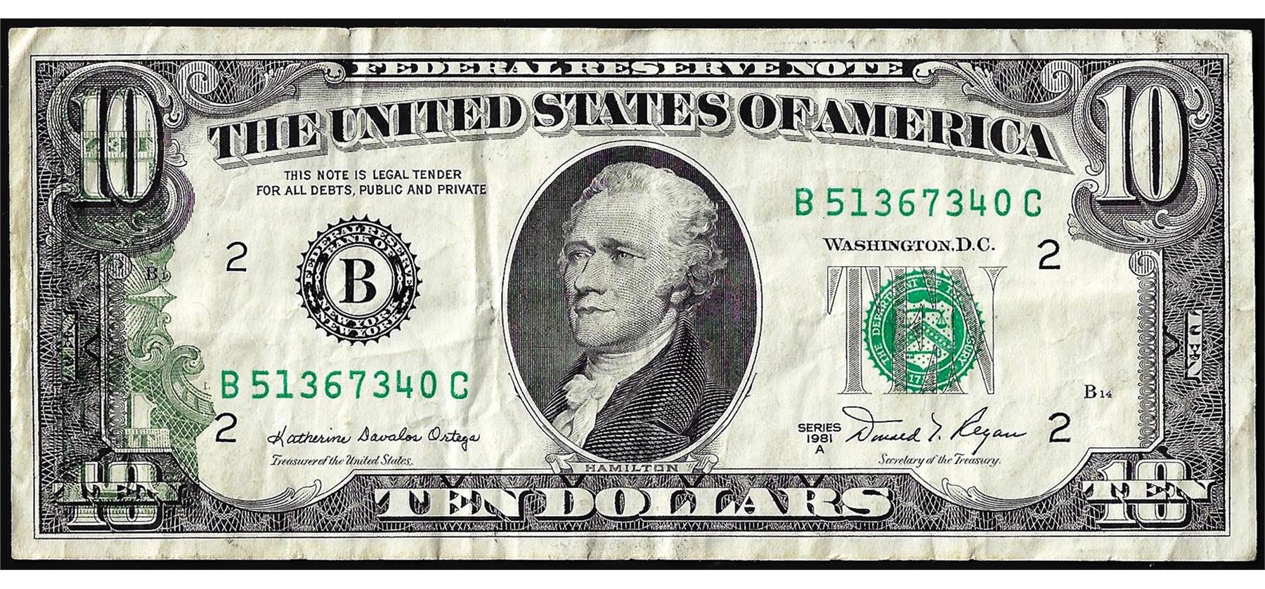 One 1981A $10 Federal Reserve Partial Offset and Ink Smear Error Note.