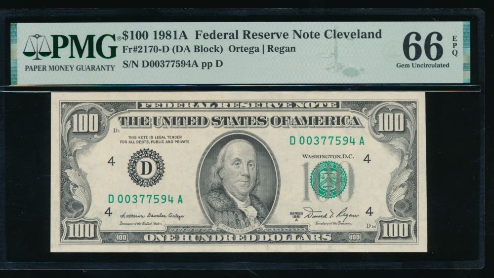 One 1981A $100 Cleveland FRN PMG 66EPQ.