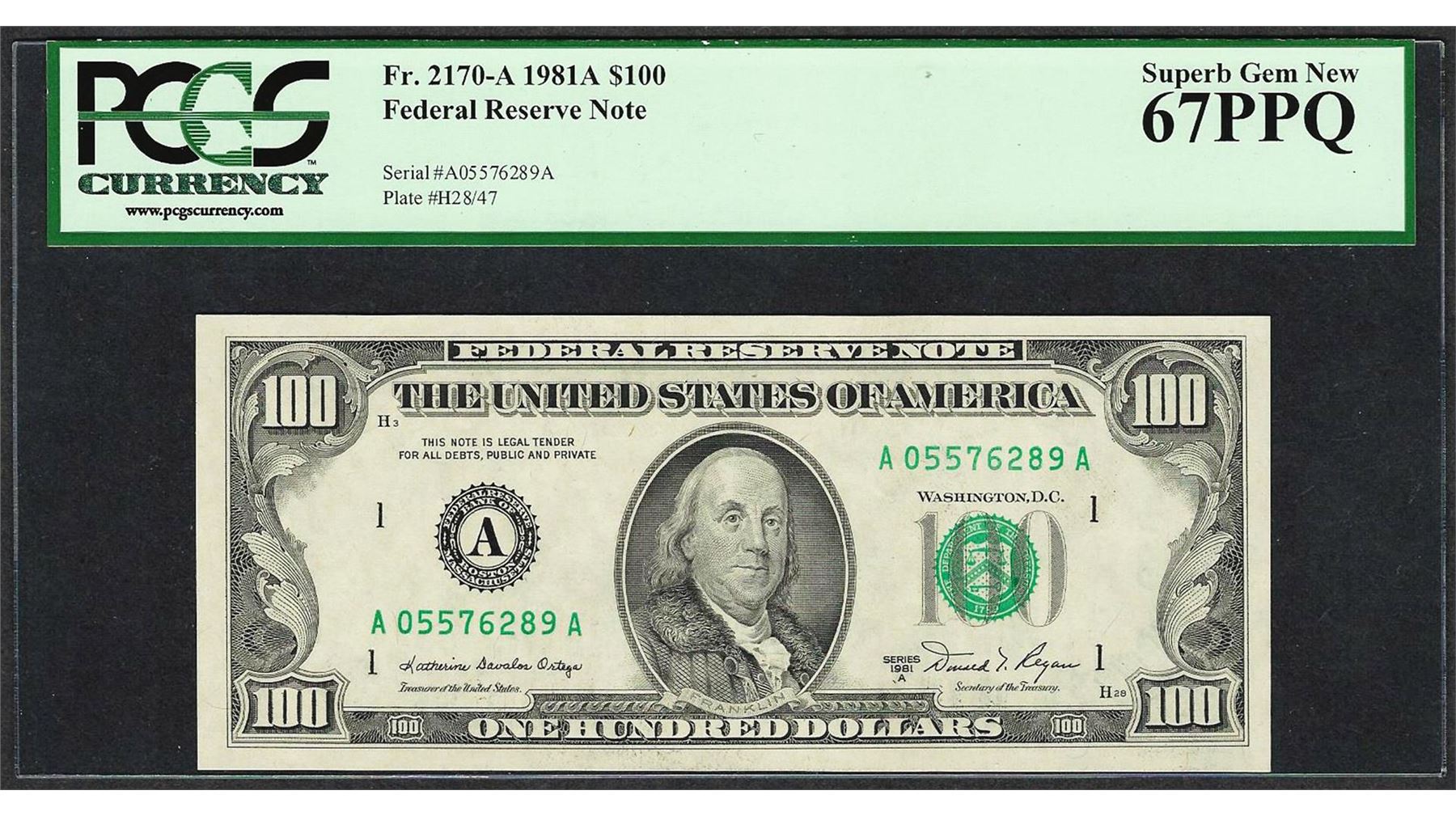 One 1981A $100 Federal Reserve Note Boston Fr.2170-A PCGS Superb Gem New 67PPQ. PCGS Graded.