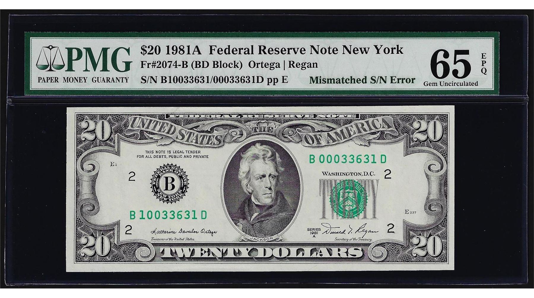One 1981A $20 Federal Reserve Note Mismatched Serial Number ERROR PMG Gem Unc. 65EPQ. PMG Certified.