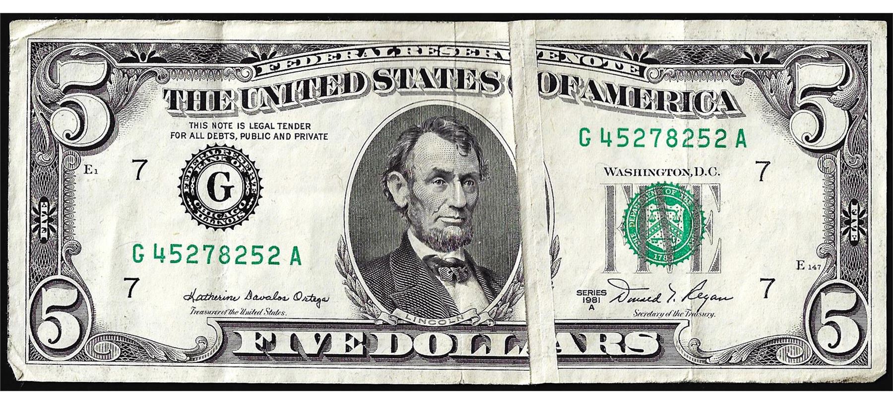 One 1981A $5 Federal Reserve Gutter Fold Error Note.