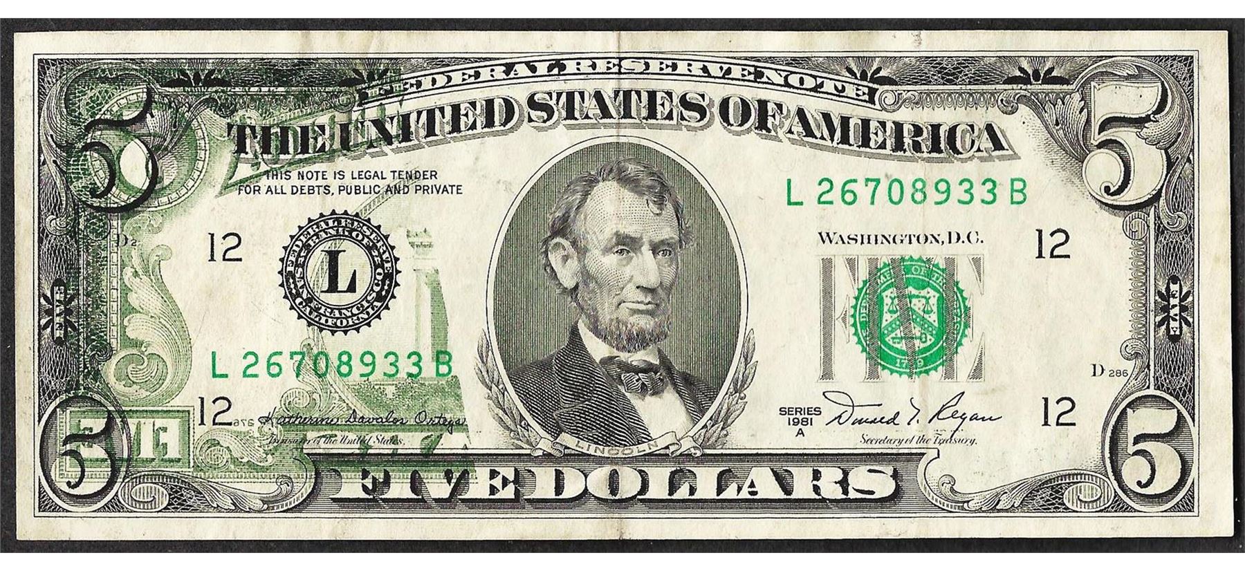 One 1981A $5 Federal Reserve Note Partial Offset ERROR.