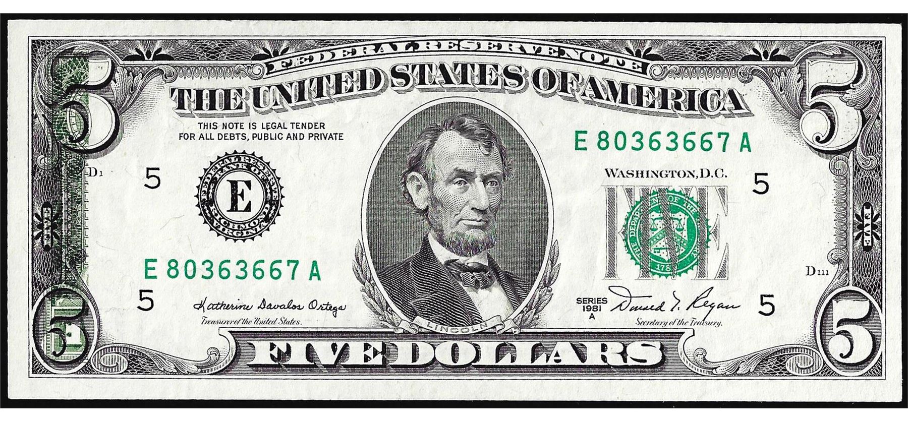 One 1981A $5 Federal Reserve Note Partial Offset Error.