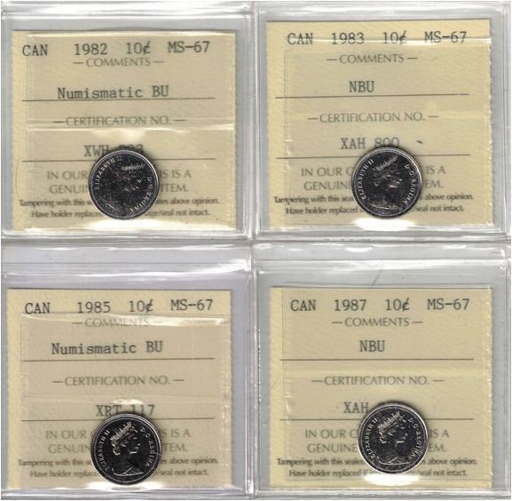 1982 10¢ MS67, 1983 10¢ MS67, 1985 10¢ MS67, 1987 10¢ MS67, 4pcs All ICCS, NBU