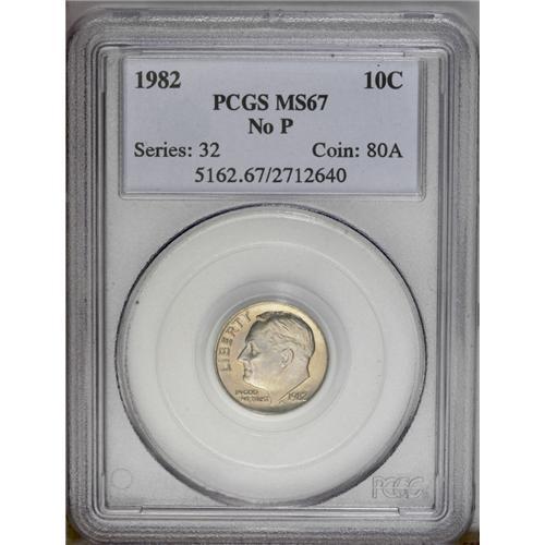 1982 10C No P MS67 PCGS. Light tinges of silver-gray a 1982[10C] No P MS67 PCGS.