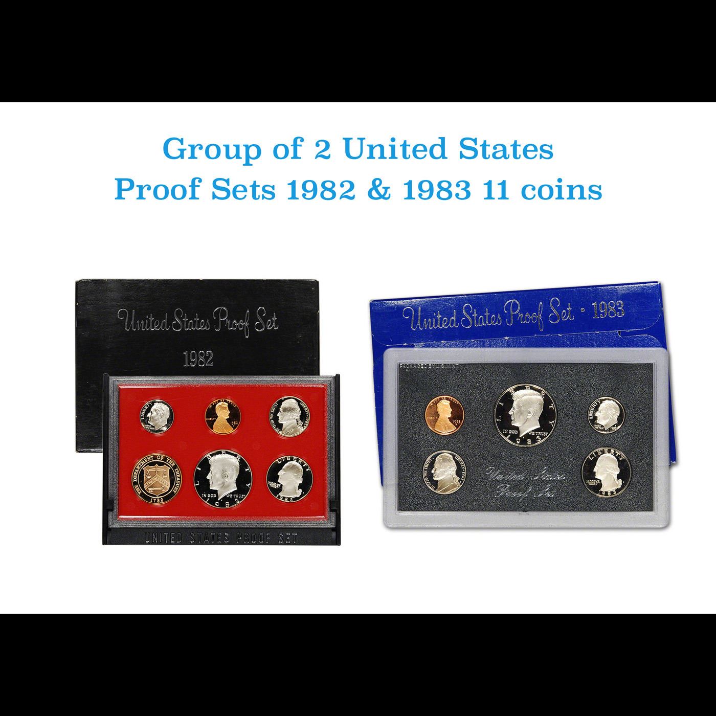 1982 & 1983 United States Mint Proof Set In Original Government Packaging. The 1982 Proof Set Includes 5 Very Deep Cameo Proof Coins, Plus The Mint Medal Coin, and the original Mint Packaging. The 1983 Proof Set Includes 5 Very Deep Cameo Proof Coins, the original Mint Packaging.